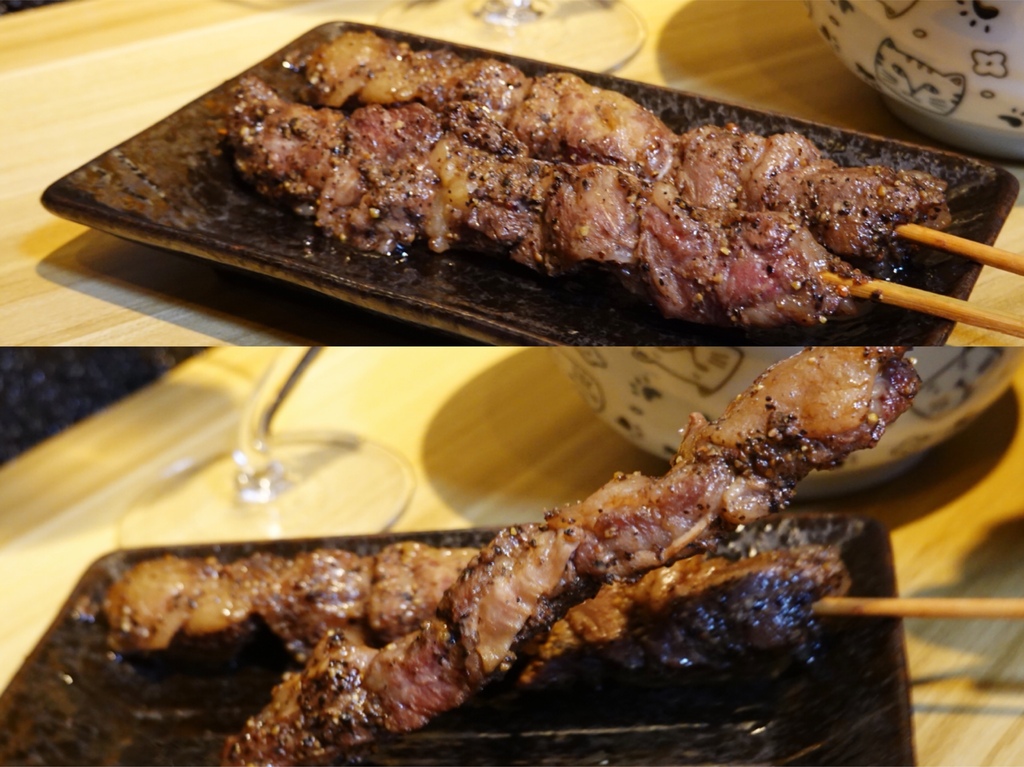 牛肋串油花較多,一旁還有些許的筋,經由烤箱燒烤咬起來較有口感些。