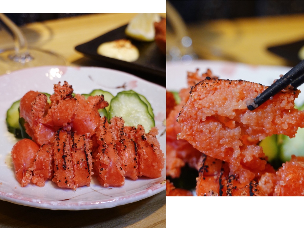 直接將鹹香的明太子炙燒,軟中帶些顆粒感,口感很棒,由於醃漬物本身鹹度就比較高,所以和一旁的清爽鮮脆小黃瓜超級合拍,這不來上一杯啤酒真的不行。