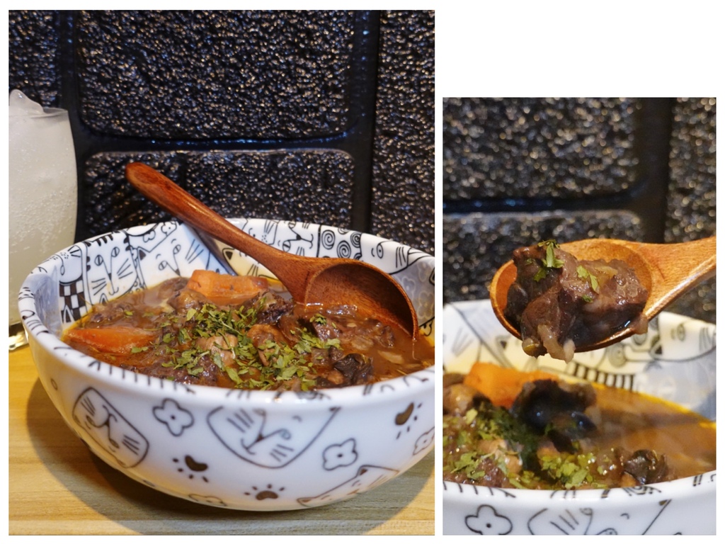 對我來說這是道頗具大人味的紅酒燉牛肉,帶有微苦的紅酒味,保留著酒感。裡面有蘑菇、紅蘿蔔及牛肉塊,迷迭香香料味足,適合搭配有氣泡感的柚詩情人。
