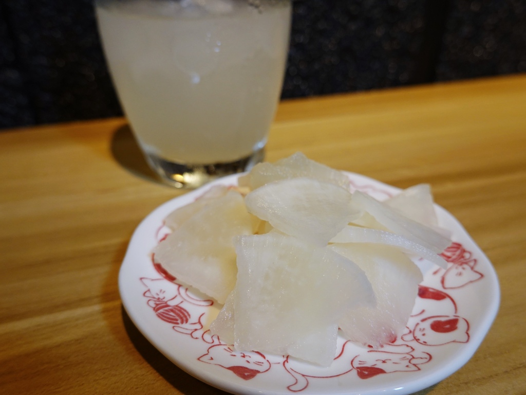 片的很薄的白蘿蔔甜中帶酸,脆口清爽,適合點來解解肉品或炸物的膩口。