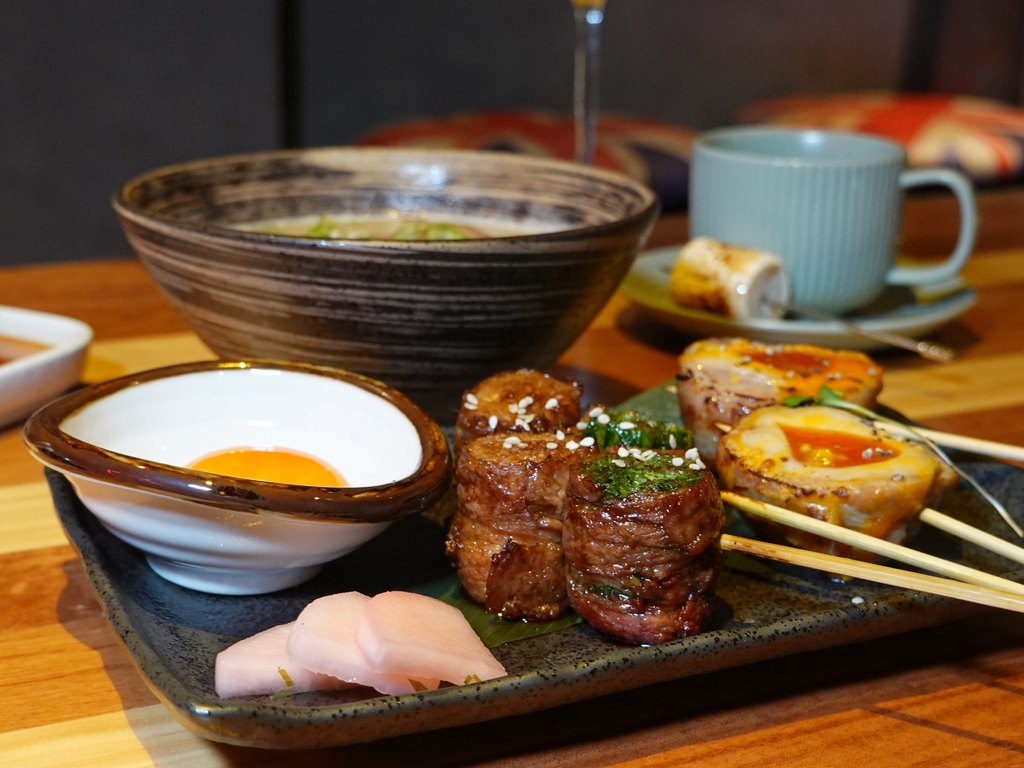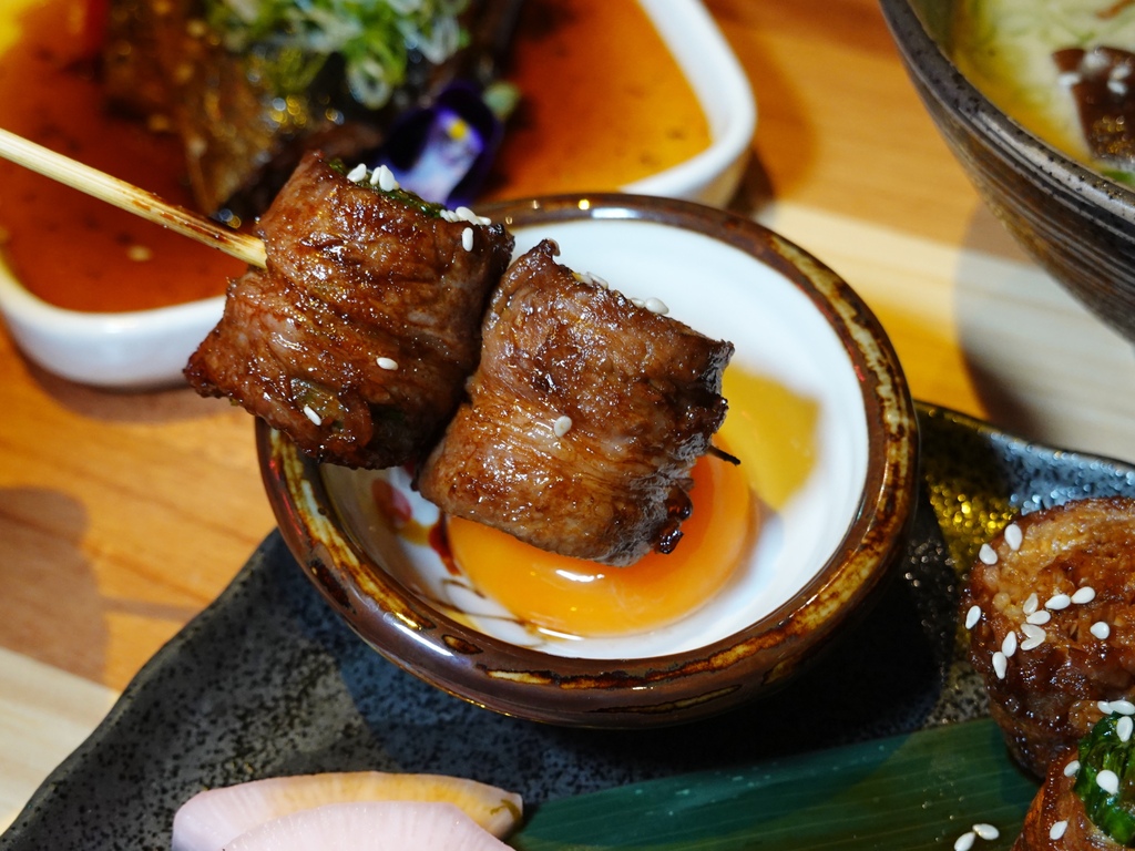 這道壽喜燒牛肉串同樣令我驚豔,以牛肉分別捲進金針菇及水耕A菜,食用前再沾上生蛋黃,口感細緻且清脆,絲毫不輸一般日式串燒店的品質。