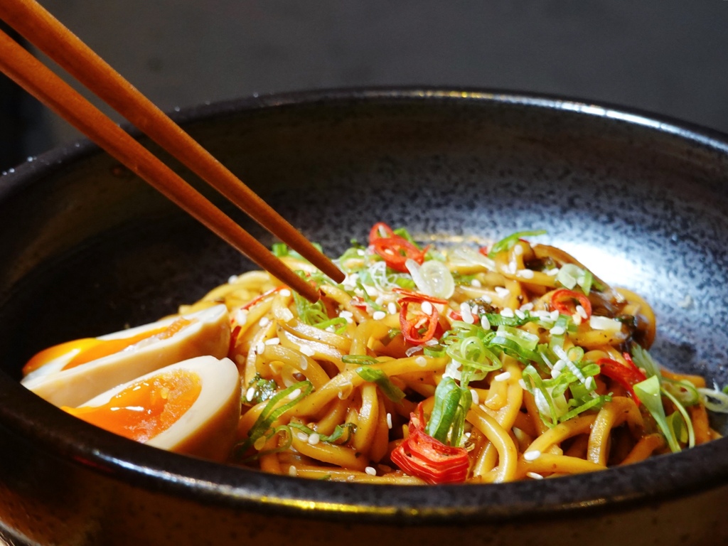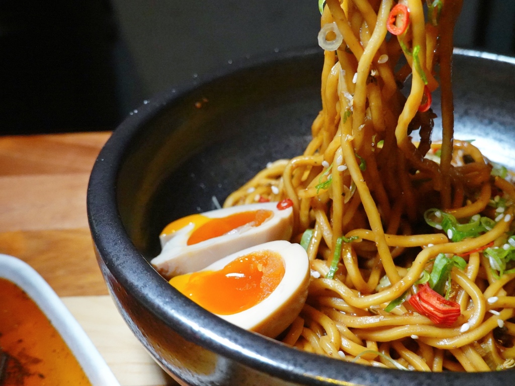 辣味噌醬已被均勻的裹在偏粗的麵條上,上頭的蔥花、芝麻、香菜及辣椒不僅增添了香氣,也為賣相加了不少分,當然最吸引我的,莫過於以紅心雞蛋製成的半熟溏心蛋。