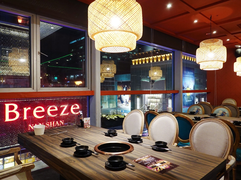 老闆除了對食材品質的要求之外,也花了近千萬打造出帶些東方味的華麗風格,其中最炙手可熱的VIP座位,就屬這能鳥瞰信義區夜景及微風南山的窗邊座。
