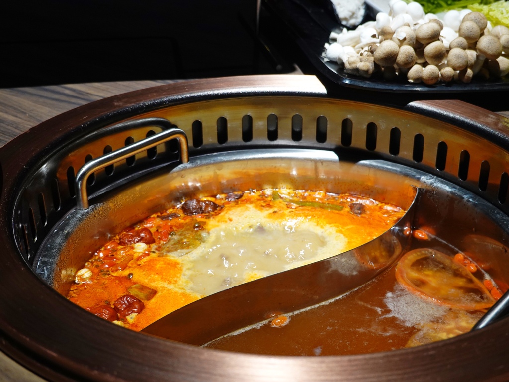 「辛巴適麻辣鍋」的湯頭有五種,可任選兩種成鴛鴦鍋。我分別選了比較清淡的柚子塩搭配重口味的麻辣紅湯。