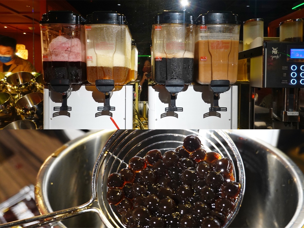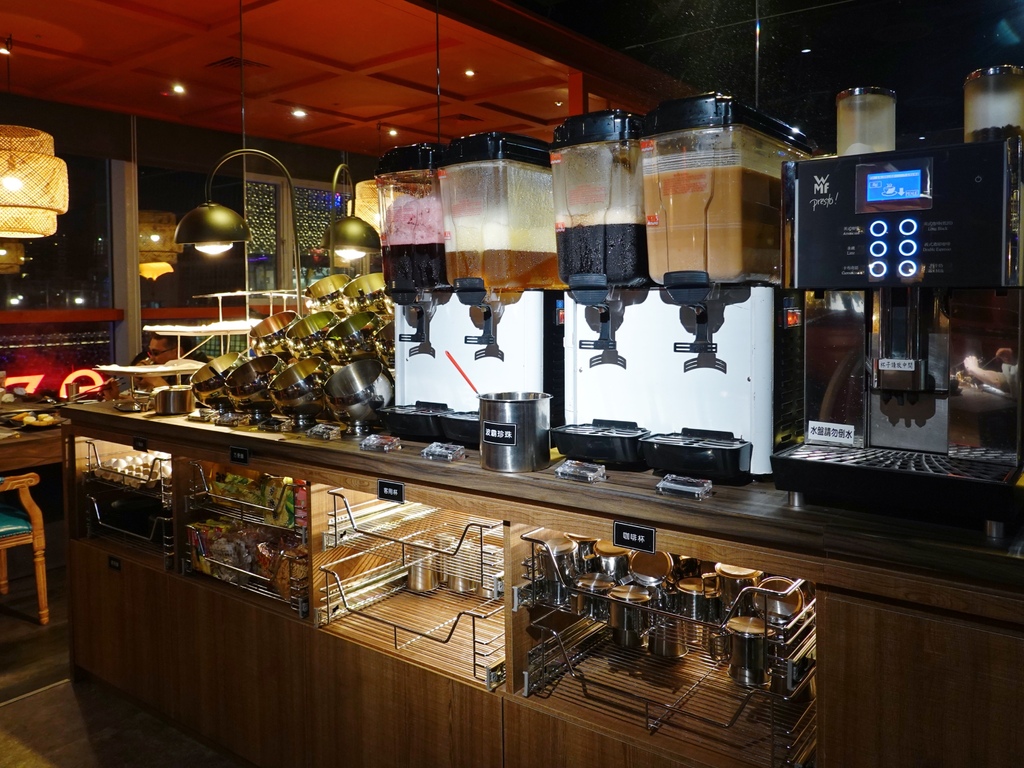 「辛巴適麻辣鍋」的自助取用區同樣十分驚人,各式冷、熱飲應有盡有,還有提供珍珠可以自製成珍珠奶茶,咖啡茶飲也都沒少。