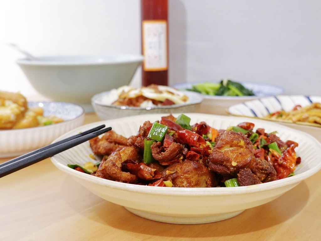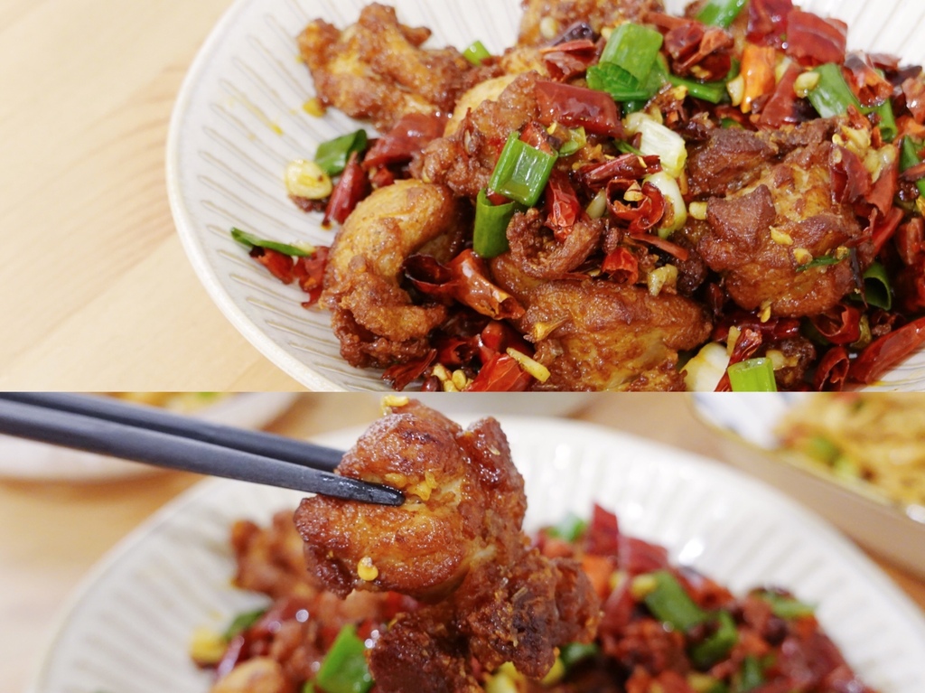 將帶雞皮的土雞肉塊過油後,以乾辣椒、蔥花、花椒、蒜末、孜然等辛香料拌炒,香氣撲鼻。雞丁外酥內軟,帶椒麻香氣的微辣十分下飯,但卻不會過油重鹹,表現不凡。