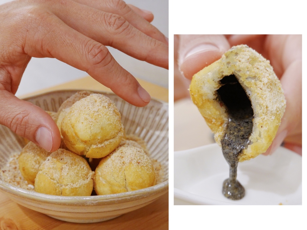 有別於常見的炸紅白小湯圓,「招治飯店」的是炸芝麻湯圓。