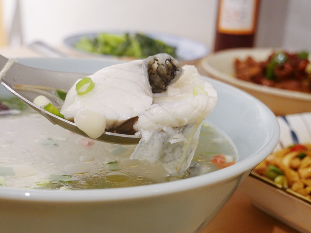 以往吃到的薑絲鱸魚湯,都為了蓋過魚腥味,所以大把大把的加,以致於薑絲的辛辣味成為了主角。但「招治飯店」的反而鱸魚本身是重點,肉厚又滑嫩,薑絲跟蔥花僅是綠葉調味,口味很清淡清爽。