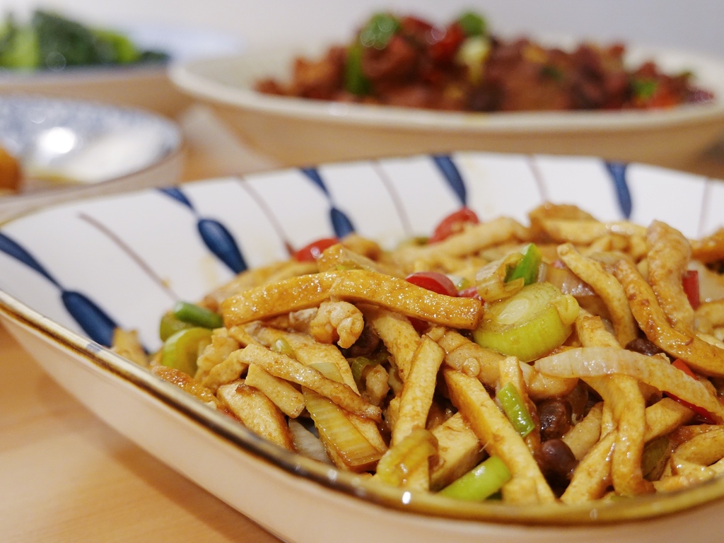 將豬肉及豆乾切成細絲,再以豆瓣醬為主的特製醬料拌炒,加上辣椒蔥花增添香氣。