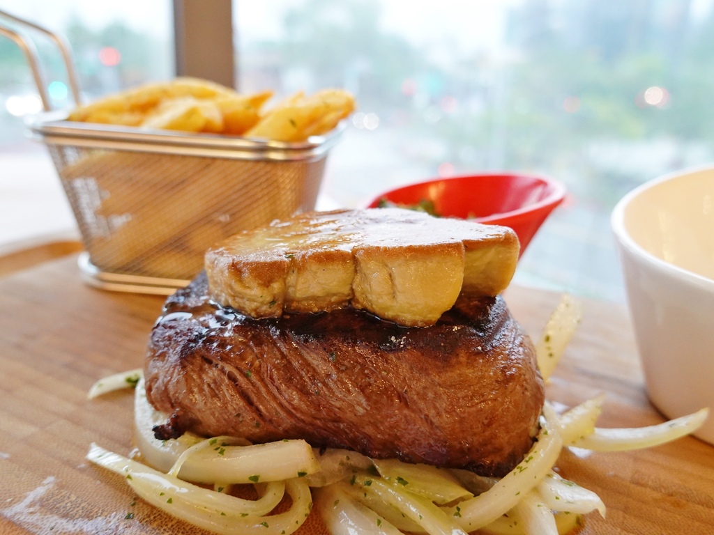 先將菲力牛排表面煎過後靜置,再放入烤箱烤至五到七分熟,上頭再放上另一主角鴨肝,份量算是挺足。下頭的洋蔥我覺得更是一大亮點,保有脆度但不辣口,又甜又多汁。