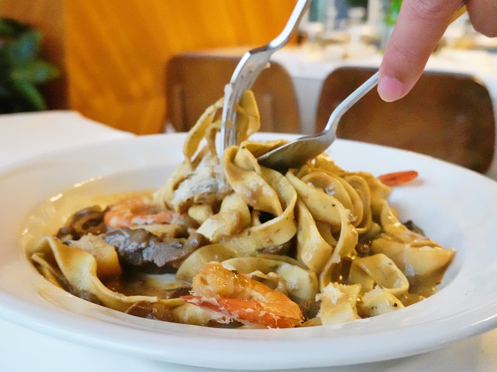 這盤義大利麵讓我最驚豔的非義大利麵莫屬,使用手切的香料闊條麵,吃起來口感很好,並有種生麵的新鮮感。