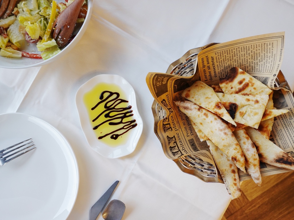 稍微薄一點的餅皮又香又脆;厚一點的餅皮可以嚐到Q度與嚼勁,兩種口感我都很喜歡,作為餐前麵包墊墊胃一不小心就會吃上癮。