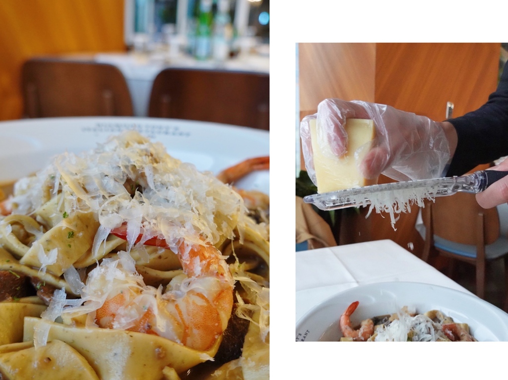 熱騰騰義大利麵上桌,服務生會在桌邊直接刨上起司,記得要趁熱攪拌,才能讓起司融化並均勻附著在麵條上。