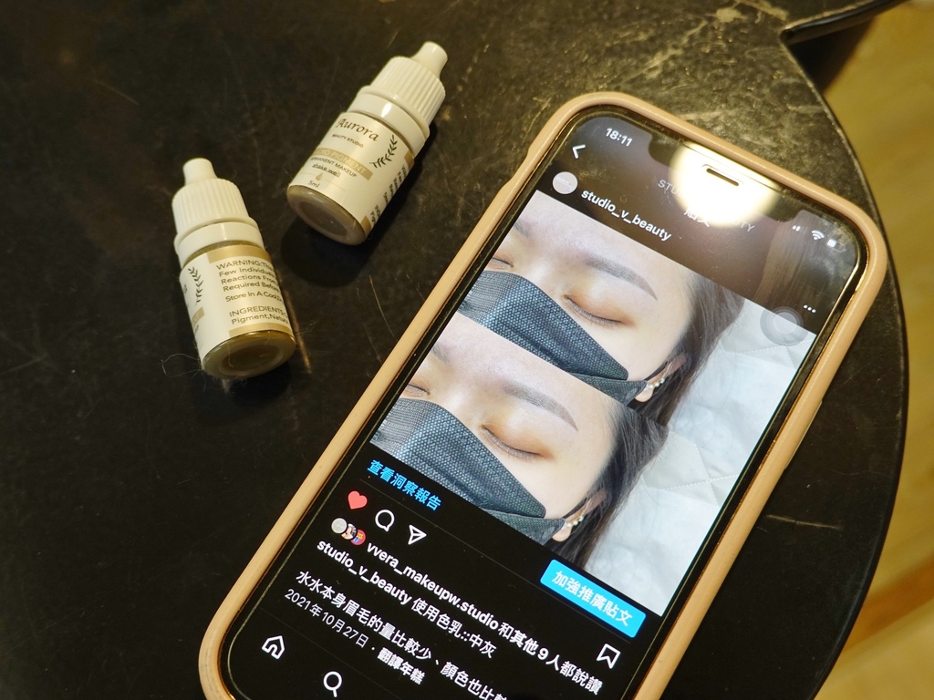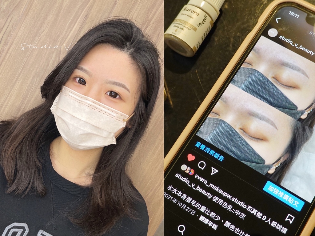 調整好眉型後,就到選擇色乳的顏色。由於我沒有染髮,所以Vera老師幫我挑選中灰搭配琥珀綠,而非單一顏色,這樣的漸層會使得眉毛顏色更為自然,避免顏色過於生硬。