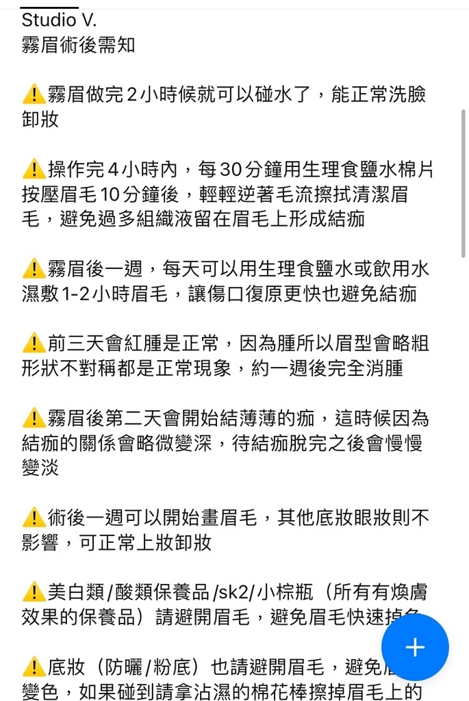霧眉結束後,Vera老師也會提醒一些注意事項,並給我些生理食鹽水棉片做濕敷。不曉得是不是手法太好,我幾乎連脫皮結痂都沒有,更不用說有什麼不舒服的地方,生活上完全沒有任何影響。