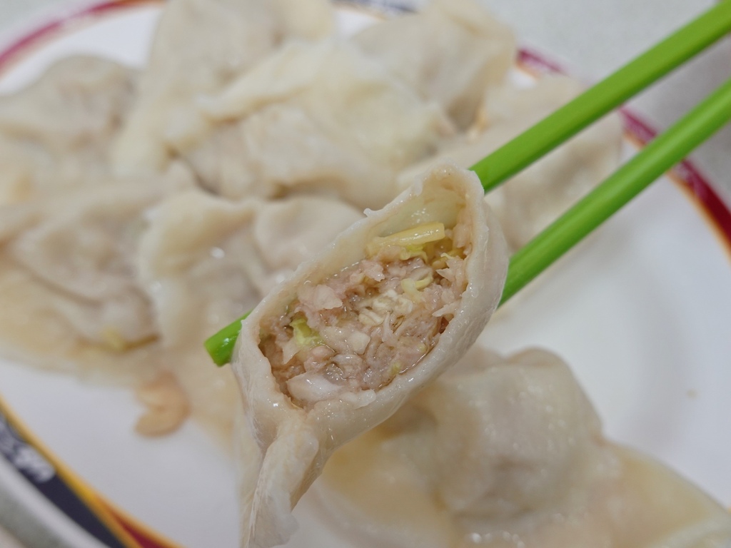 「阿亮水餃」的水餃算是滿大顆,但跟我想像中的厚實外皮有點落差。或許是煮的時間過久,外皮口感既薄又軟爛,裡頭餡料香氣明顯不足,沒有肉味,鮮甜的韭黃味更是稀薄。