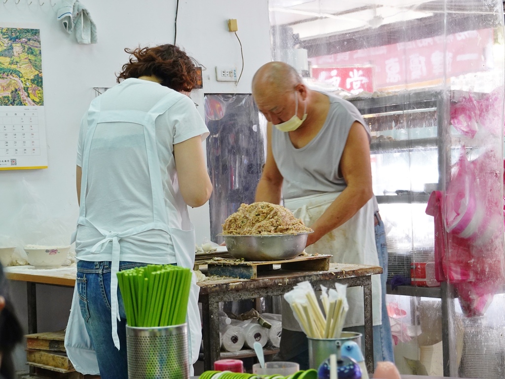 店內有一個長桌是「阿亮水餃」的工作區,店員不停的桿著水餃皮,接著包裹起餡料,一顆顆渾圓飽滿的招牌水餃就這樣誕生。