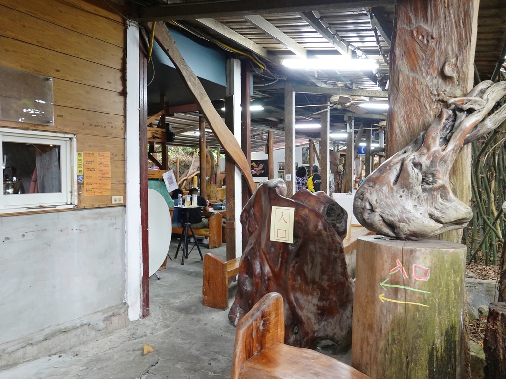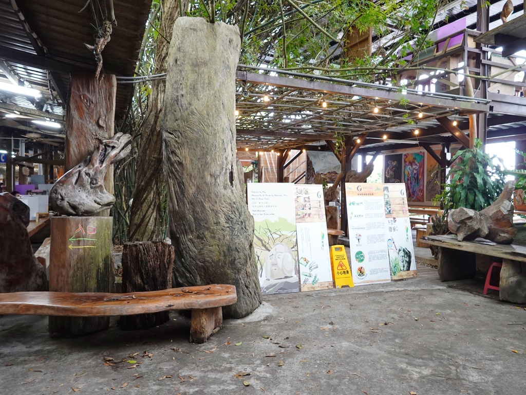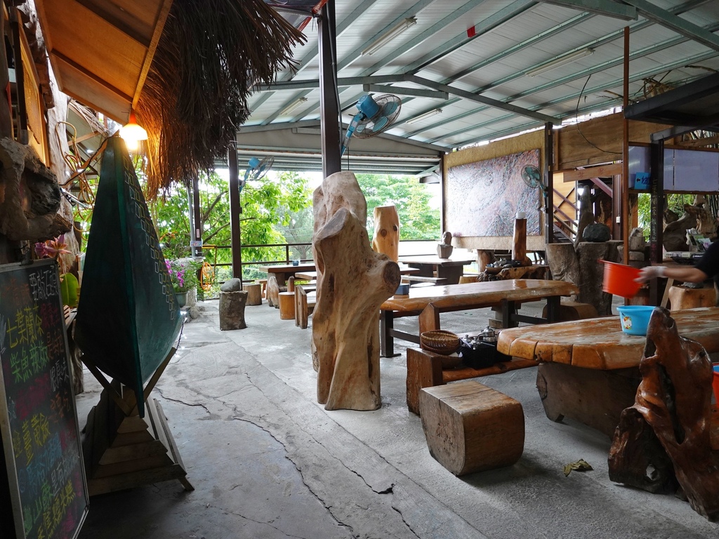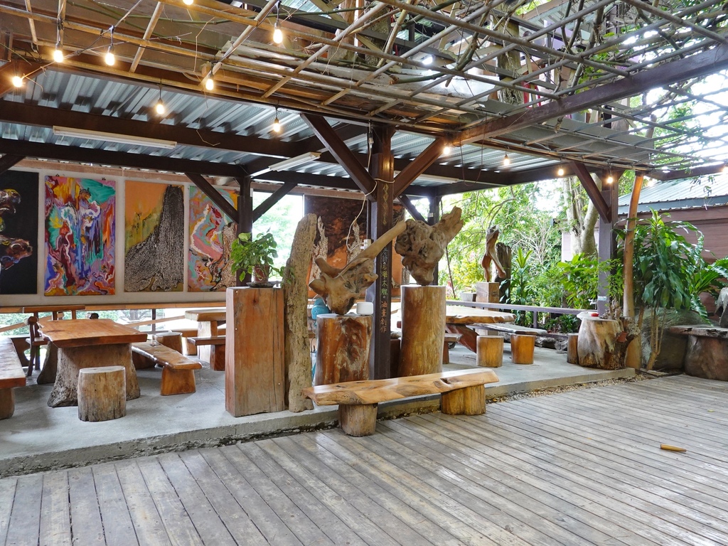 半露天的空間與樹木綠意,像是闖入叢林般具有原始風情。使用的原木桌椅及各式擺設雕刻,都是主理人郭文貴所親手打造,而妻子則是負責餐點,這裡就是他們愛的結晶。