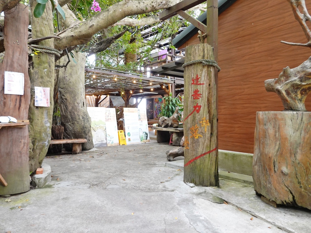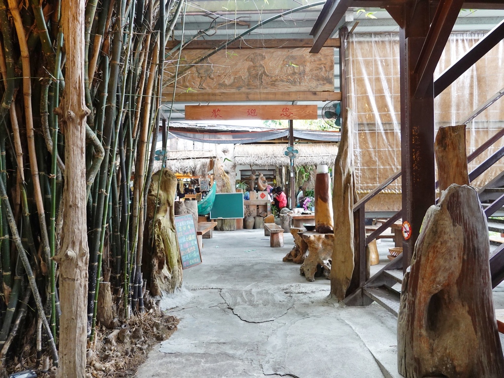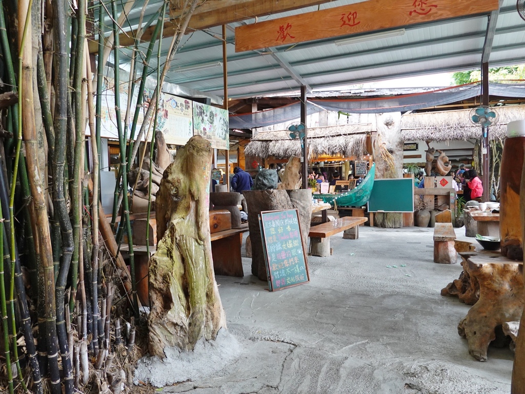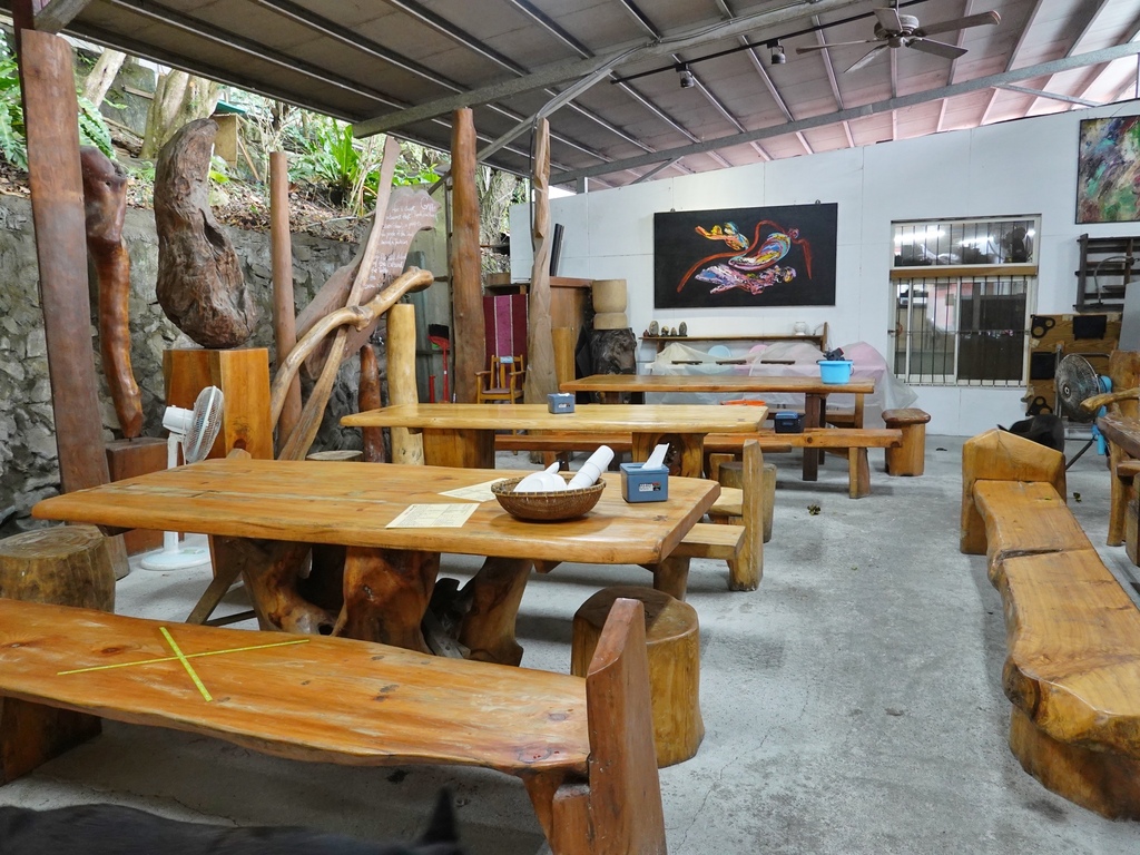 半露天的空間與樹木綠意,像是闖入叢林般具有原始風情。使用的原木桌椅及各式擺設雕刻,都是主理人郭文貴所親手打造,而妻子則是負責餐點,這裡就是他們愛的結晶。