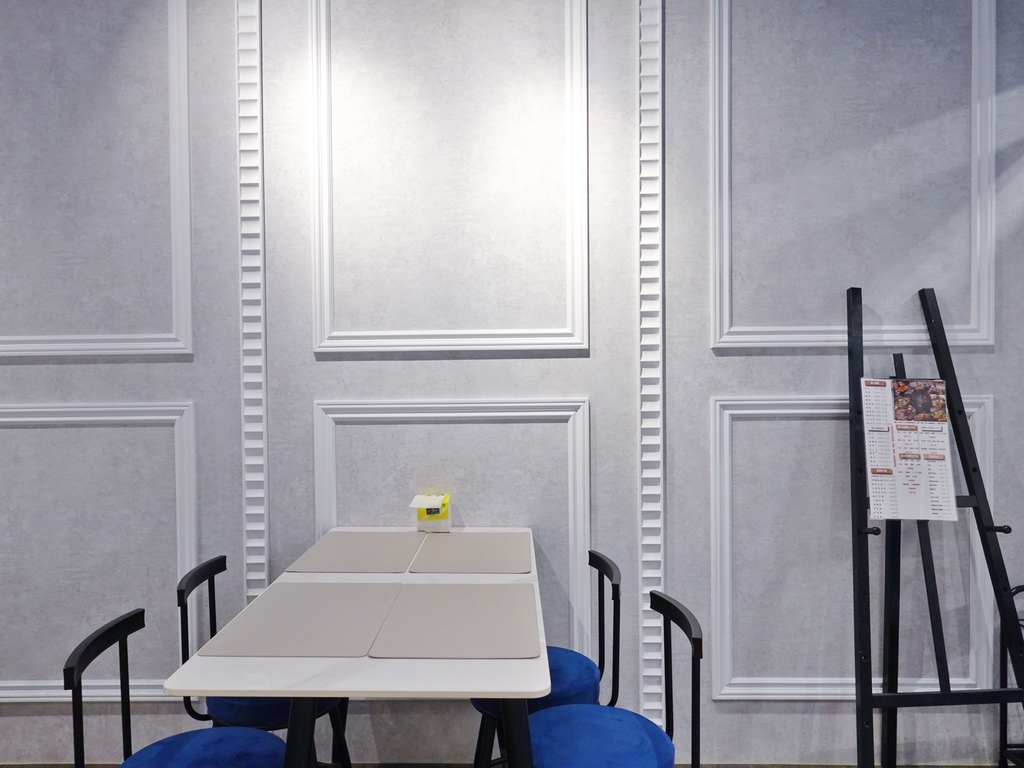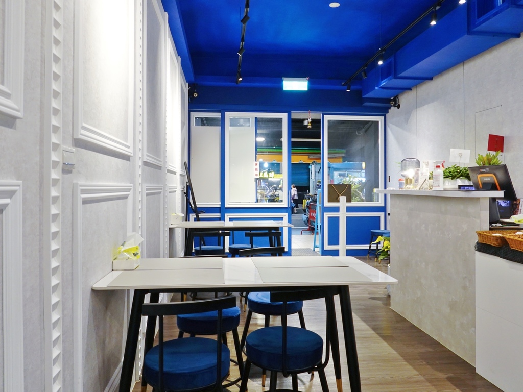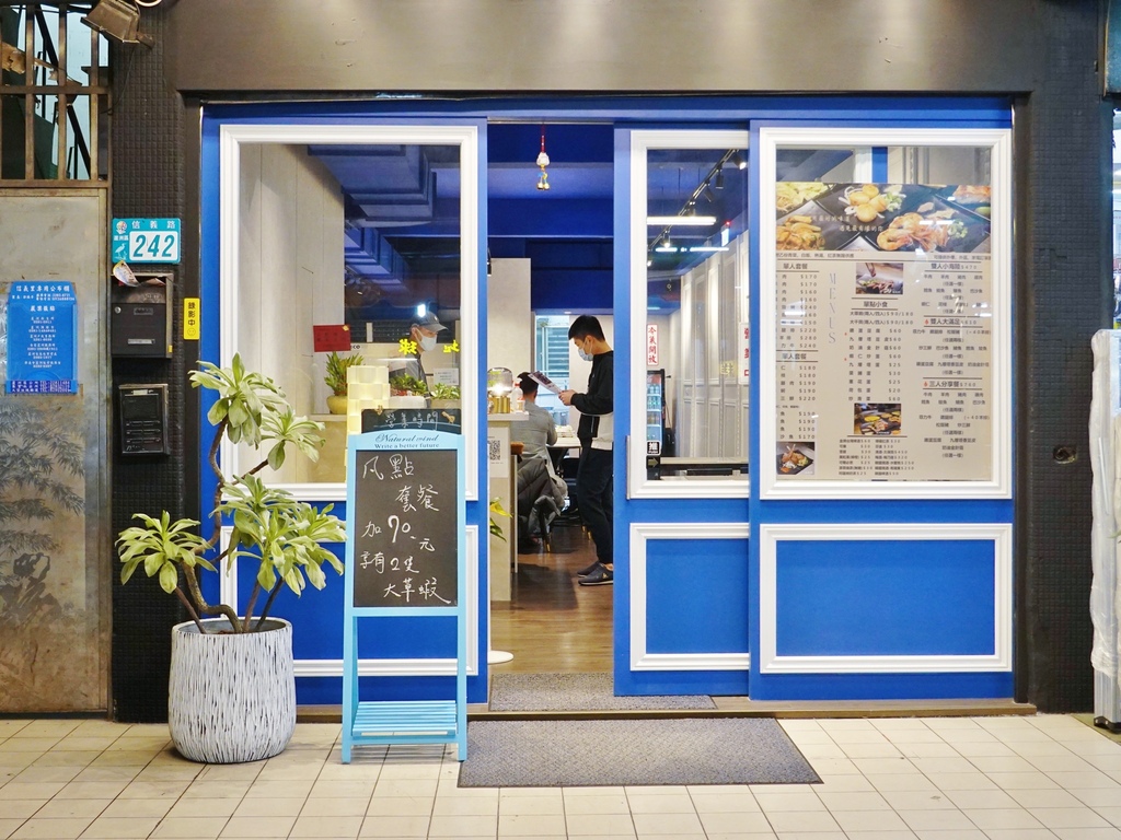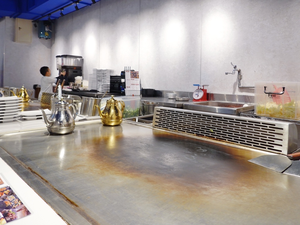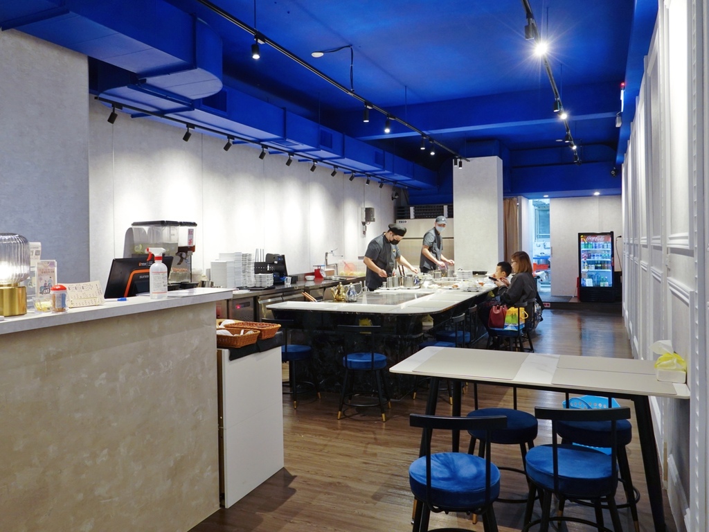藍白相間的色系,有別於以往對於平價鐵板燒昏暗又油煙味重的刻板印象,光是從門外看就覺得乾淨且舒適。