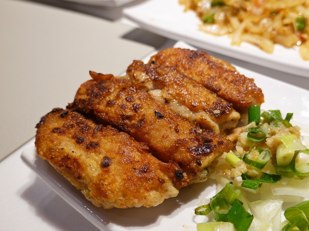 雞腿排切成長條狀而不是塊狀,每一面表皮都煎到恰恰,形成外皮酥脆口感。