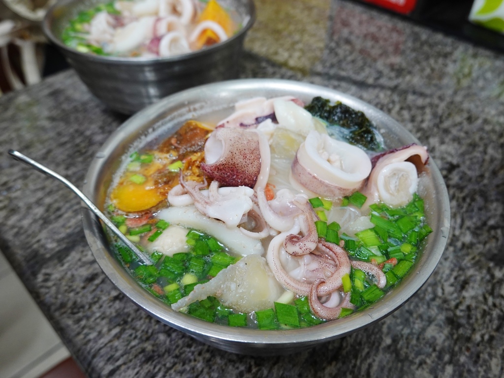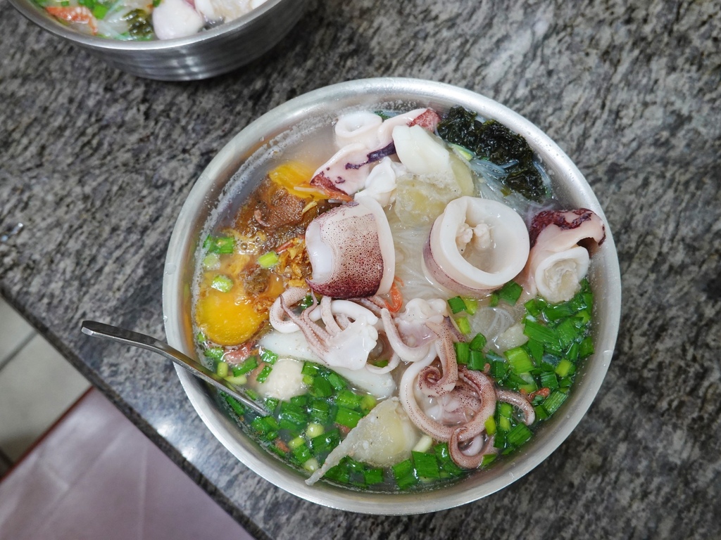 除了沈甸甸的Q脆米粉,上頭擺的一整隻小卷更是主角,新鮮嫩脆的肉質外,還能嚐到卵膘十分特別,一旁還有綿密又甜的地瓜、魚丸、蝦米、紫菜、油蔥以及韭菜。