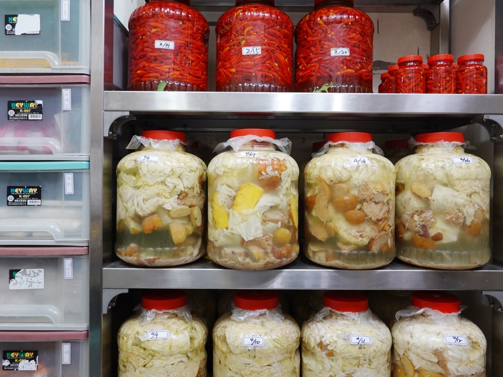店裡頭陳列滿滿的泡菜桶以及泡椒桶,可以很明顯看出泡菜是與蘋果、鳳梨等水果共同醃漬而成。