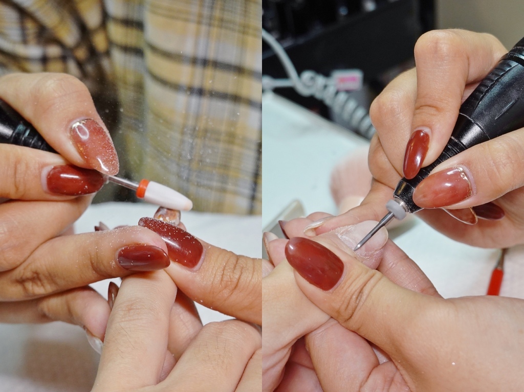小陳老師同步使用機器與修整鋼推,讓指緣及指甲表面呈現出最乾淨的一面,再進行後續的光療上膠。