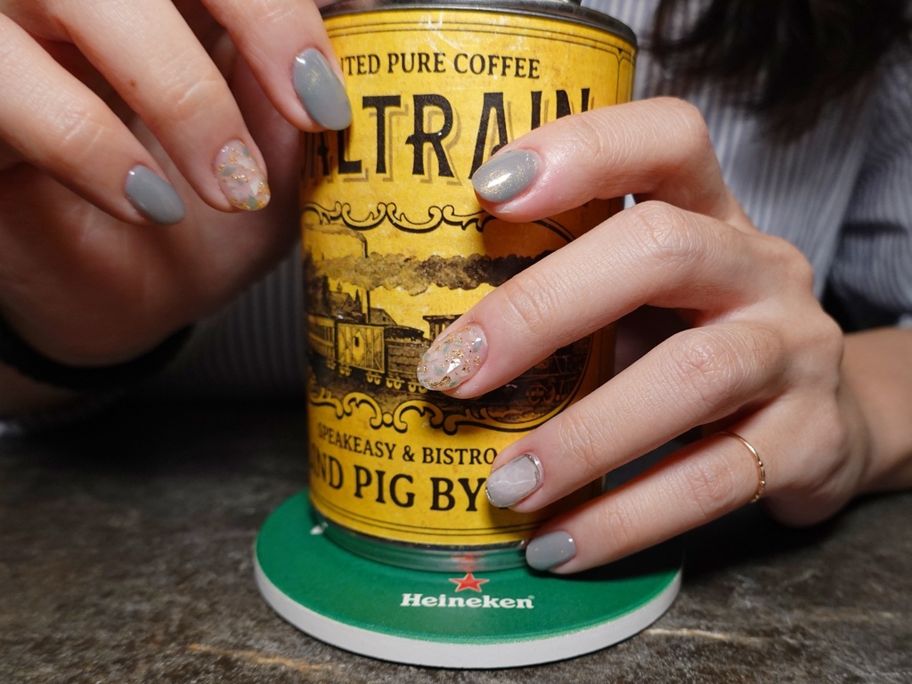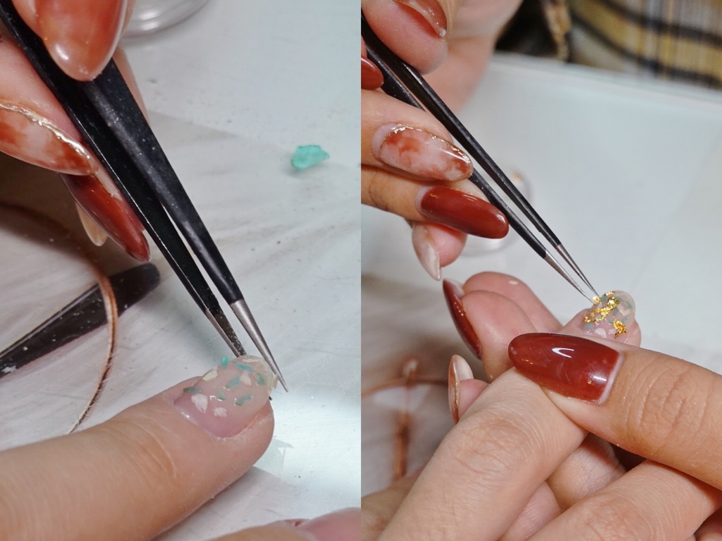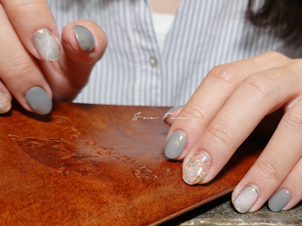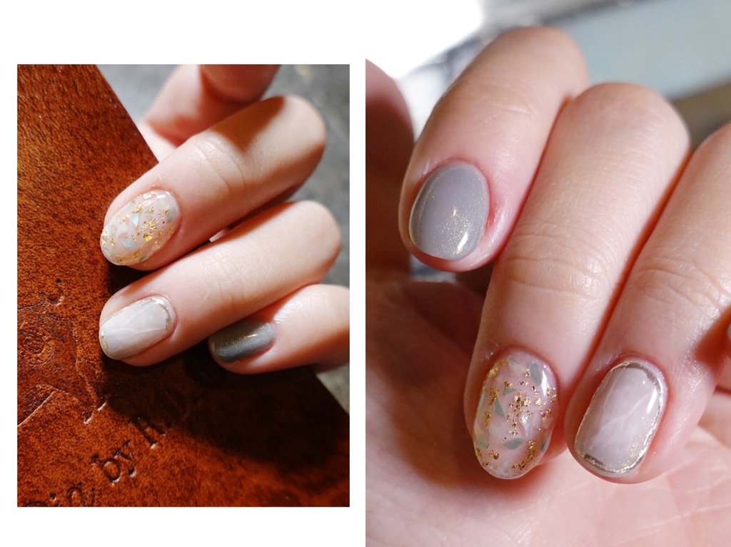 光療膠的細閃亮粉、大理石般的暈染、貝殼光與金箔的光澤,五指都有其不同的風格,卻很和諧不突兀。