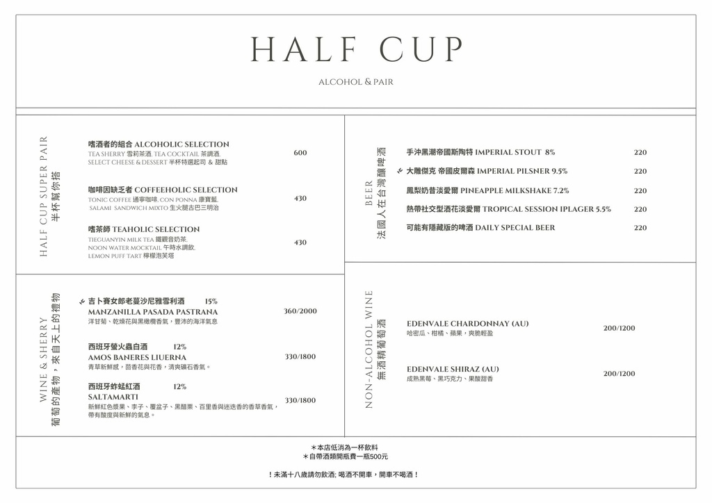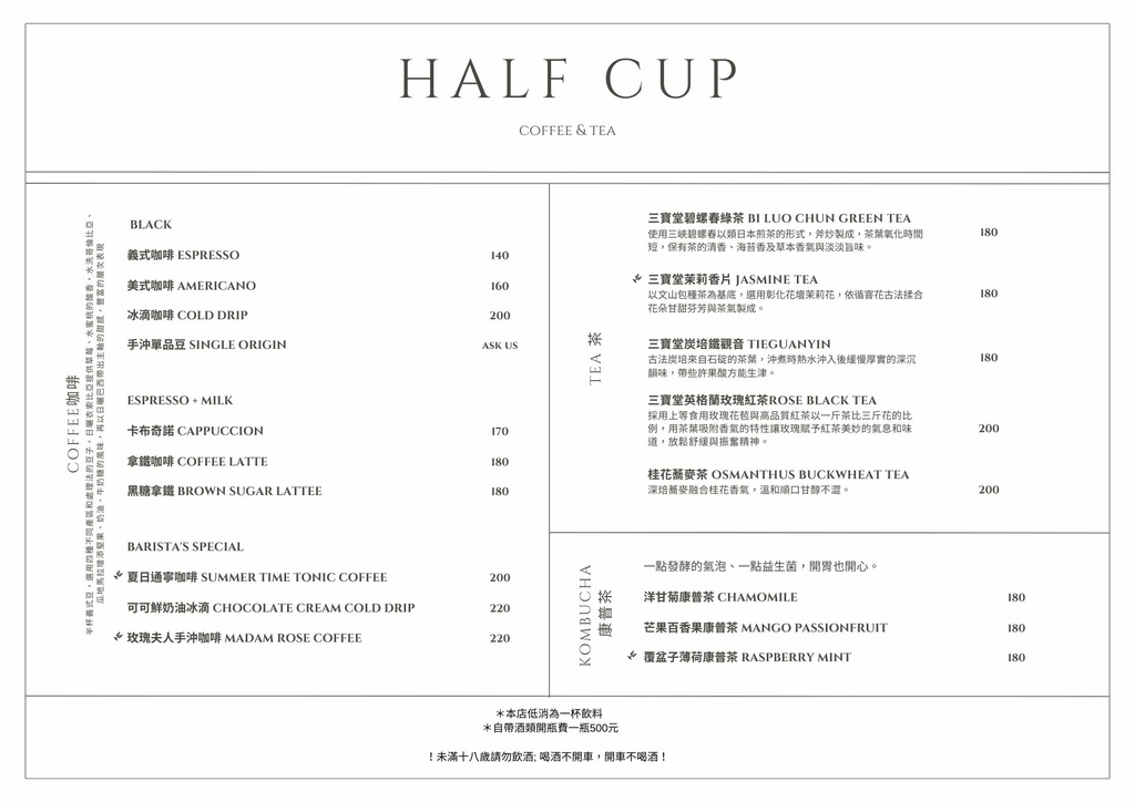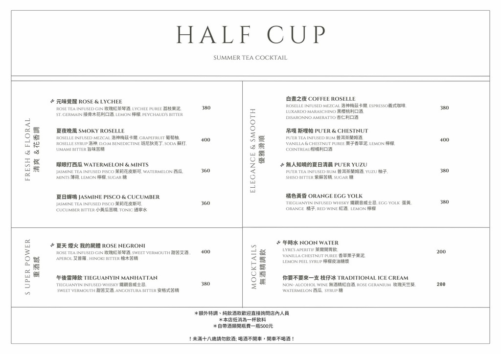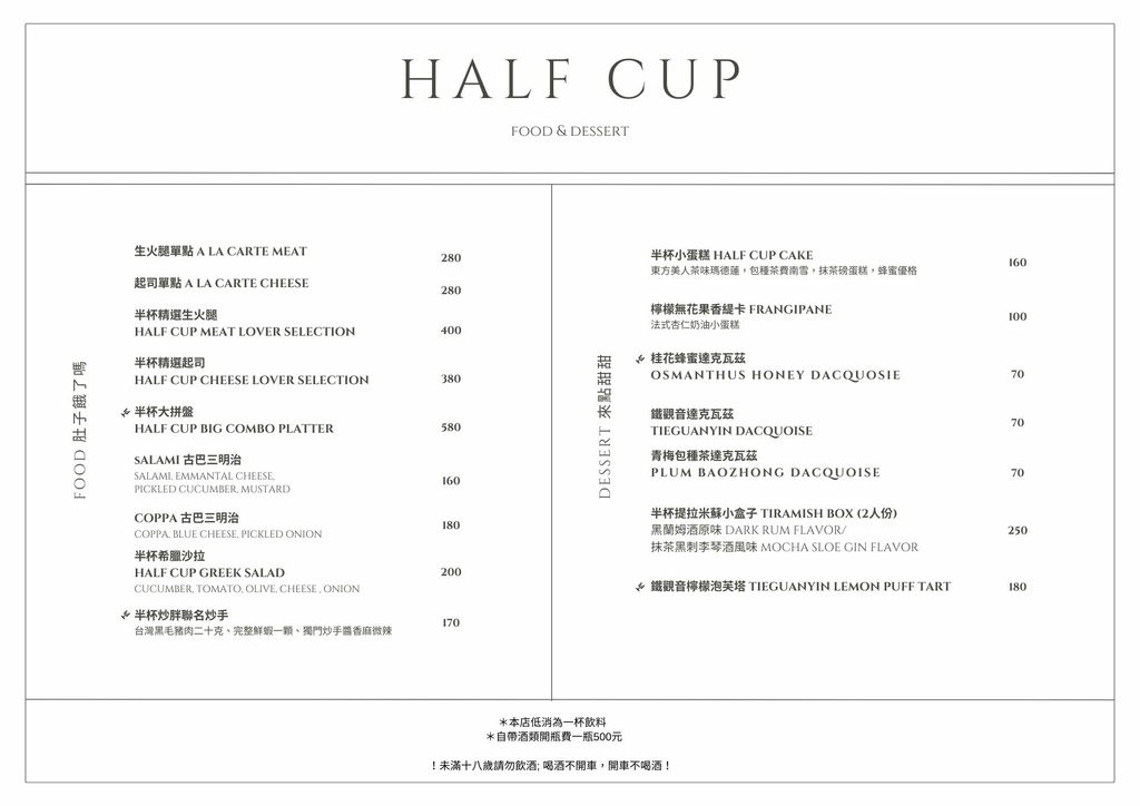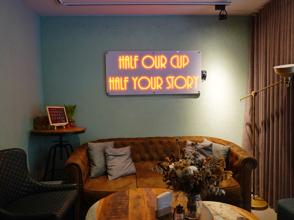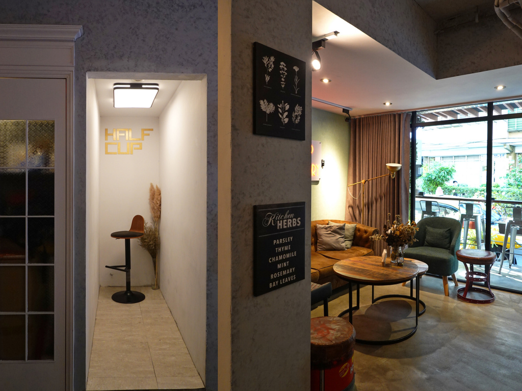老闆是個小女生,本科系的他,卻有著豐厚的國內外調酒經驗,而甜點則是他的興趣,因此打造出來這間結合自己熱忱與專長的「HALF CUP 半杯」。
