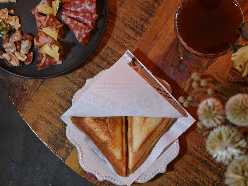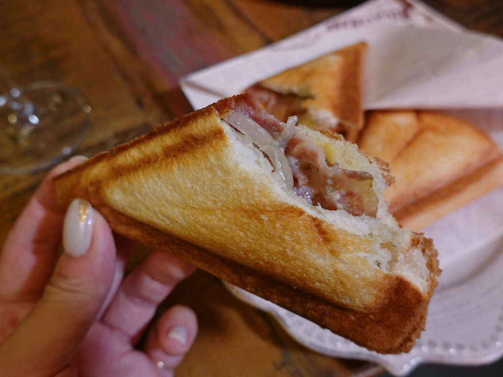 一口咬下,先是烤的外層酥脆的吐司,接下來是COPPA濃郁的煙燻氣味以及自帶鹹度及刺激辛辣的藍紋起司,是很特別且強烈的一道鹹食。