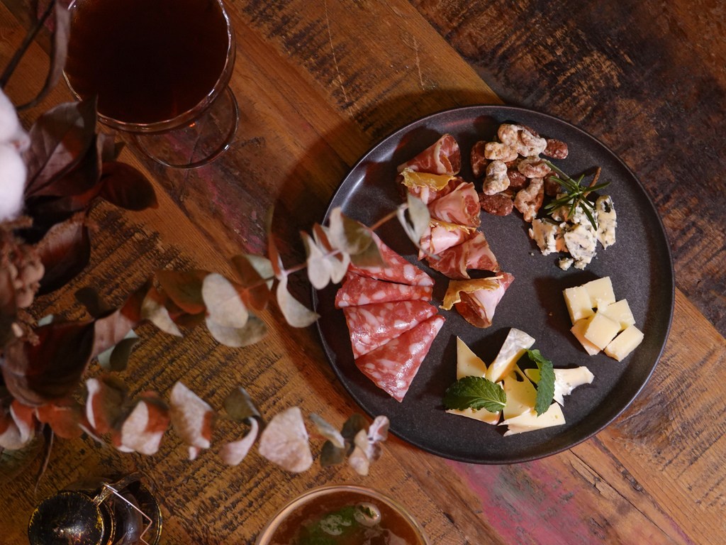 小拼盤上頭有三種起司、兩種火腿,還有「HALF CUP 半杯」的自製蜂蜜堅果以及些許果乾,這樣的份量很適合兩人約會。