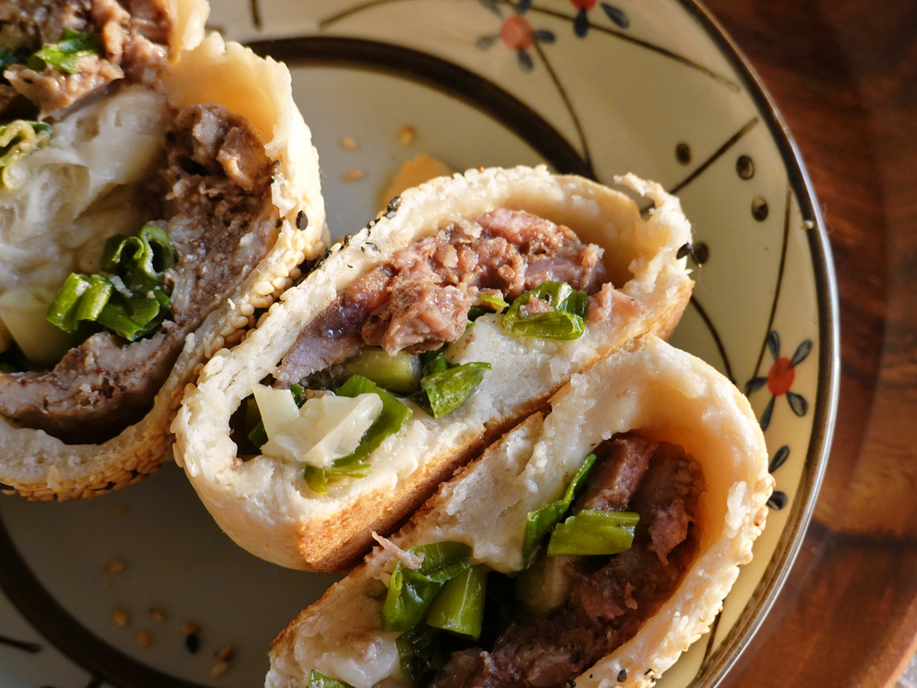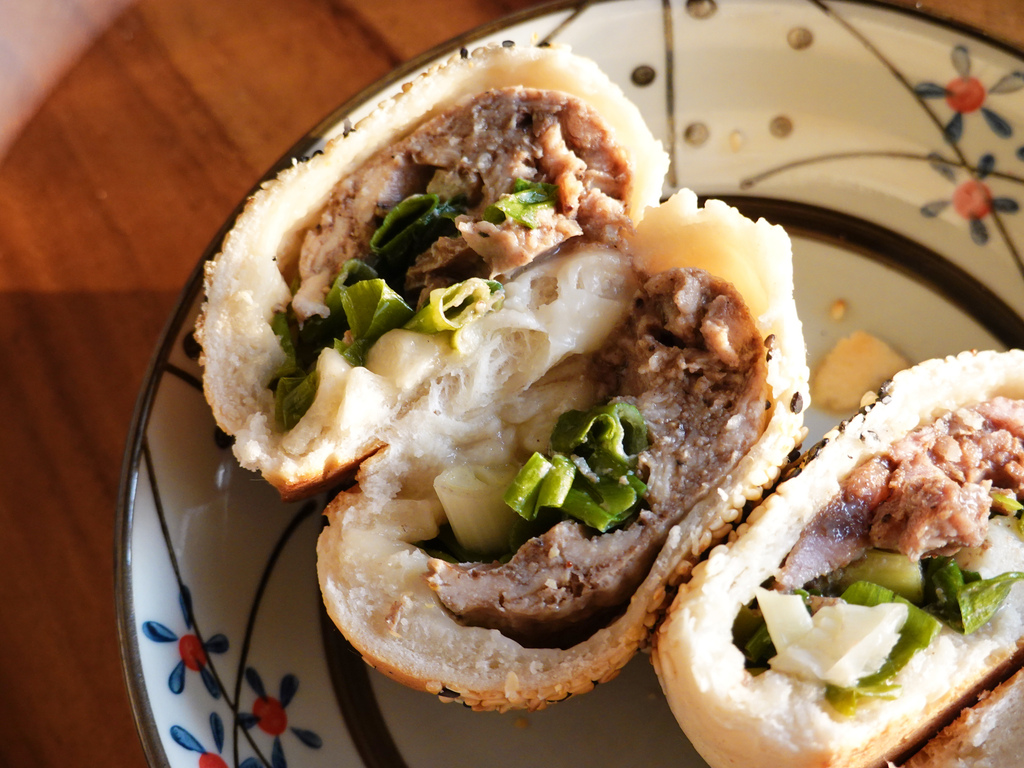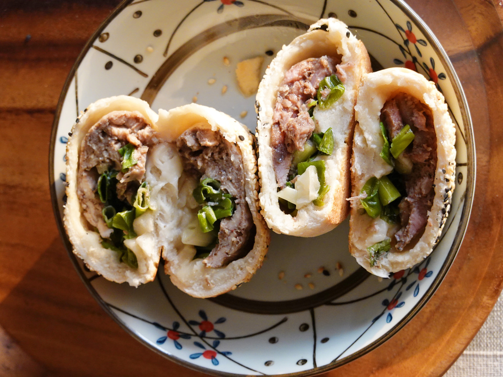 醃過的粗絞肉帶有胡椒香氣,卻不會過鹹,我很喜歡這種可咀嚼的肉感,加上蔥花可以中和掉不少油膩。餅皮也是我愛的外脆內紮實,厚度剛好,不會搶了肉塊的風采,也不會因為放涼而過乾。