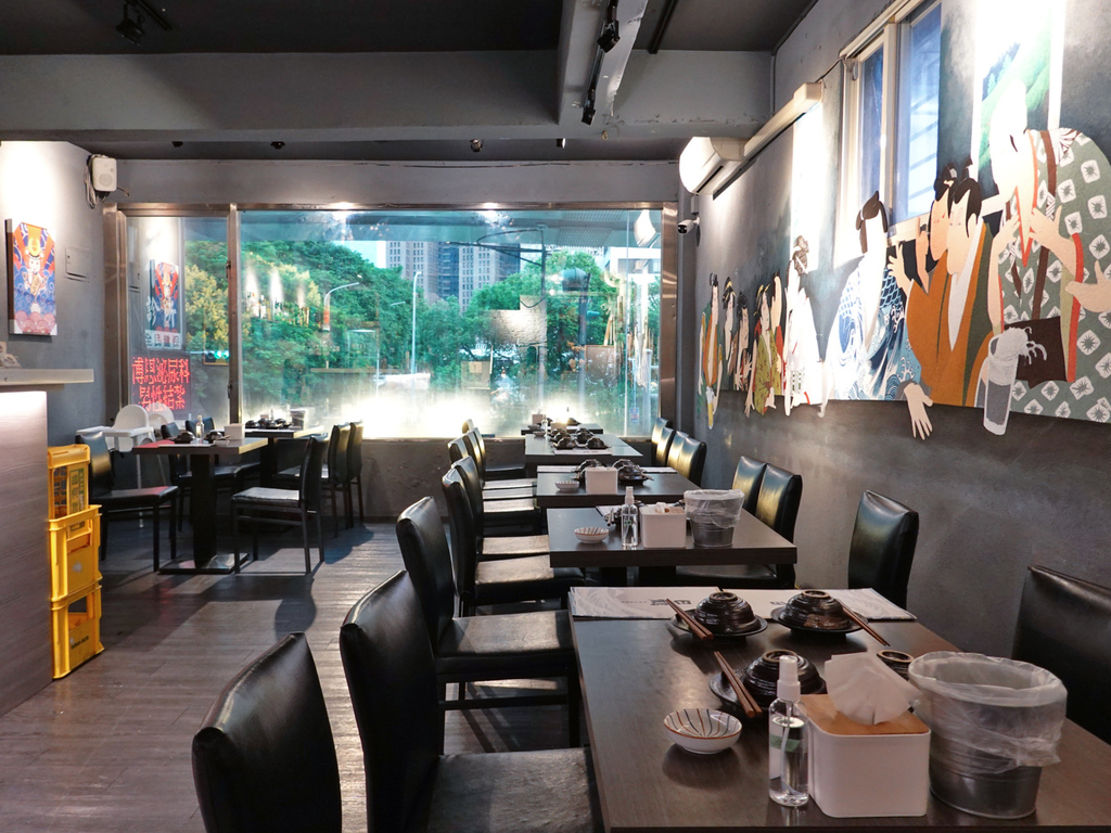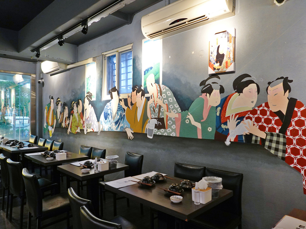 走上二樓,則是較為常見的居酒屋桌型座位,而牆上則是十分醒目的整面浮世繪畫作。