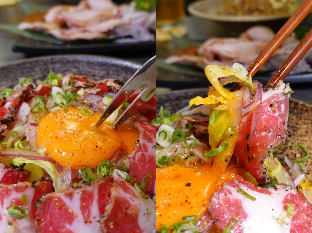 上頭的月見生蛋黃、蔥花跟下方的洋蔥絲、高麗菜絲,替整道生牛肉增加了數種吃法,無論以翼板牛沾取蛋黃食用,甚至在隨性夾取下方的生菜,都是濃郁口感中又透著清爽滋味的美饌。