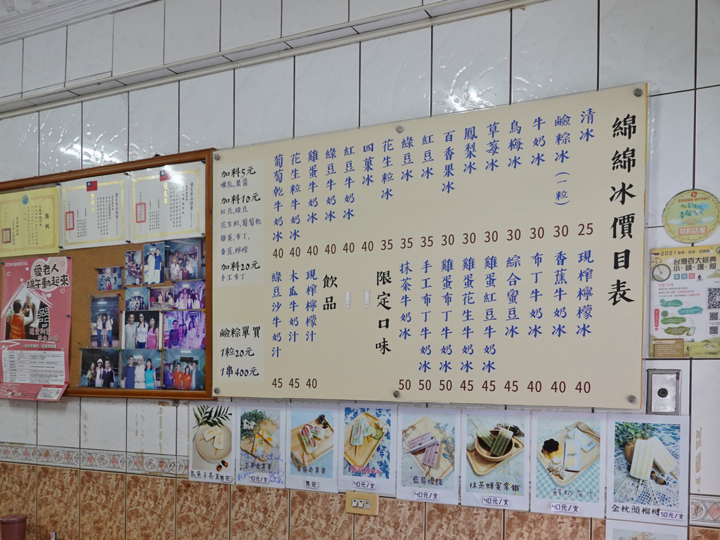 「泉芳枝仔冰」販售的品項豐富,除了枝仔冰、綿綿冰之外,還有販售較少見的鹼粽冰,而口味也是琳瑯滿目。