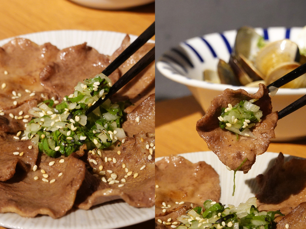 將中間的自製鹽蔥醬夾一點到牛舌上,再以牛舌包覆後吃下,芝麻跟蔥的的香氣一絕,與牛舌的油脂十分合拍。