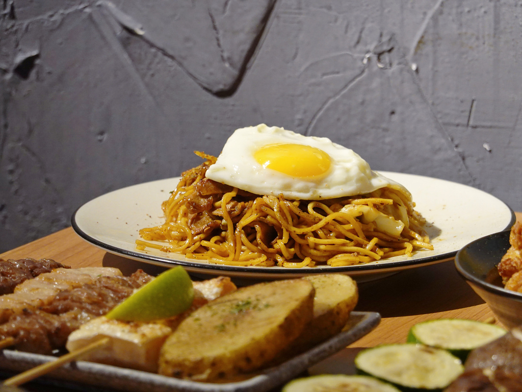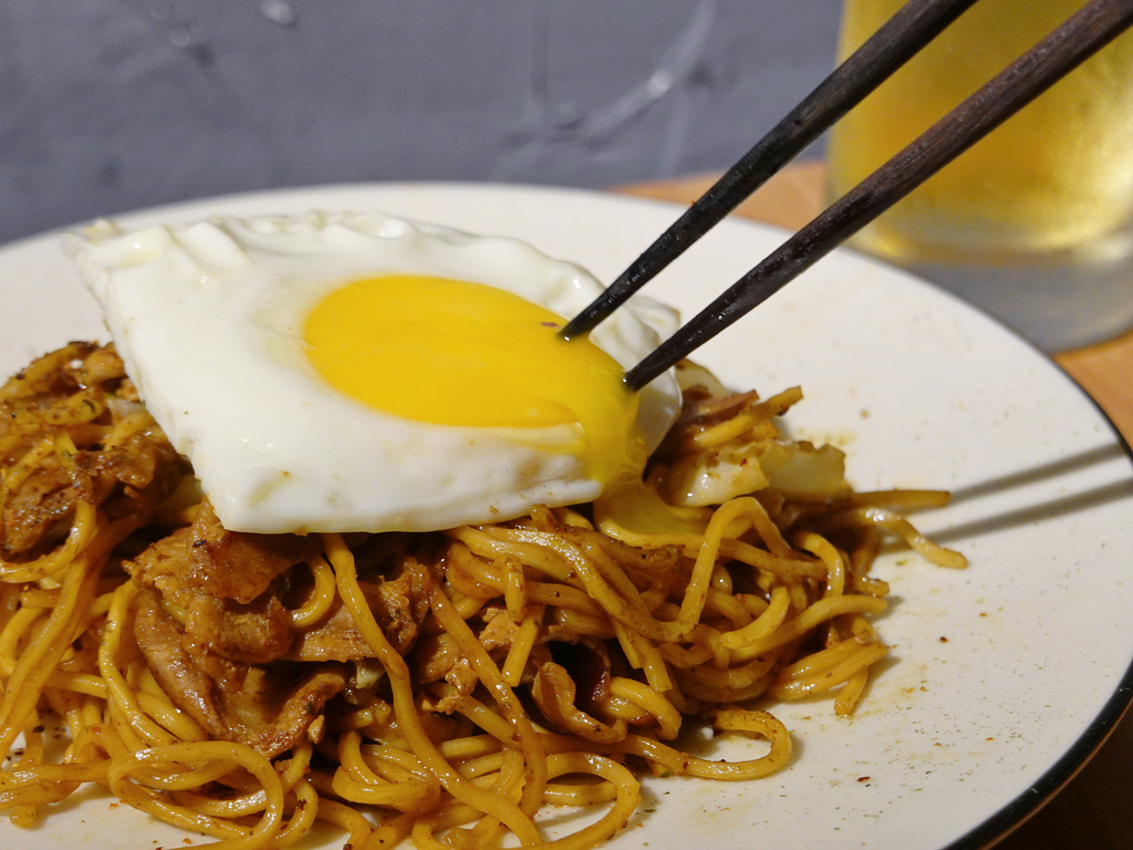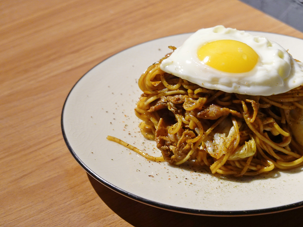 保有咬勁的黃褐色麵條,搭配鹹中帶甜,帶有黑醋香氣的日式醬汁,拌炒青脆高麗菜與豬五花,上頭擺上一顆銷魂的半熟蛋,就是一道具有飽足感的主食。