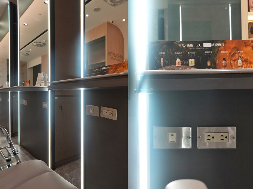 時尚的空間卻將顧客的置物區隱藏在鏡子後方,而下方則是貼心的插座區,即使坐一整天也不用擔心手機沒電的窘境。
