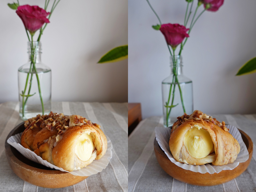 上頭的胡桃保有脆度,搭配碎糖霜的喀滋喀滋口感,跟麵包與卡士達形成反差,層次相較於一般肉桂捲豐富許多,是我心中排名前三的肉桂捲。