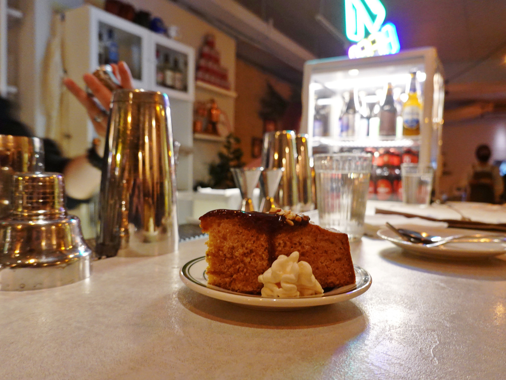 但最得我心的,是上方的焦糖醬跟一旁的奶油,焦糖醬甜中帶苦,堅果碎增添了香氣與口感;而這鮮奶油濃郁的質地同樣迷人。