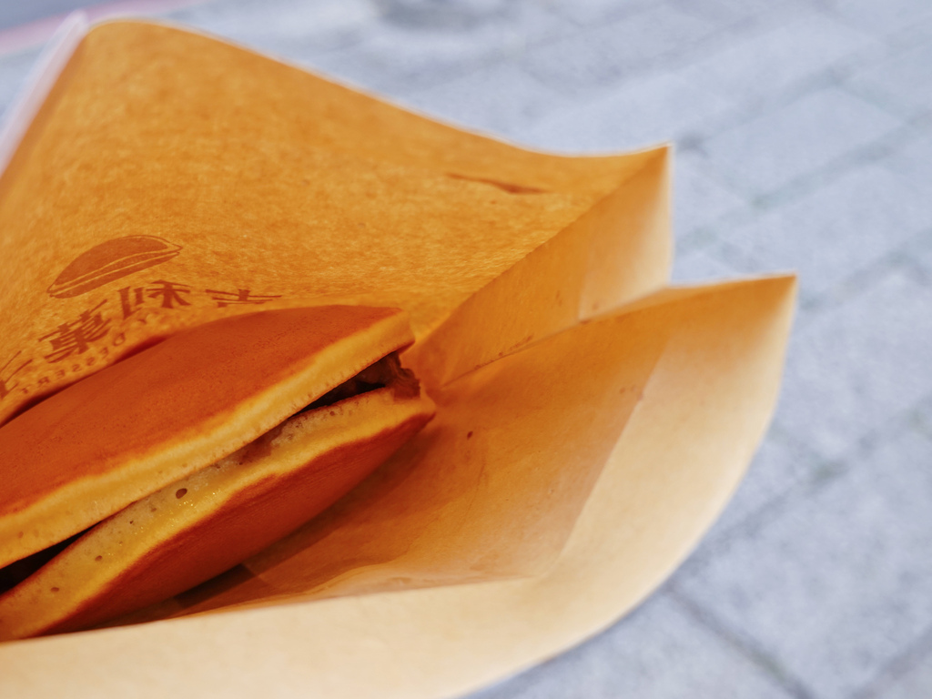 拿在手上,銅鑼燒透過紙袋還是能感受些溫熱,這種現烤餅皮就是要趁熱吃下,才能把握住最美味的時刻。