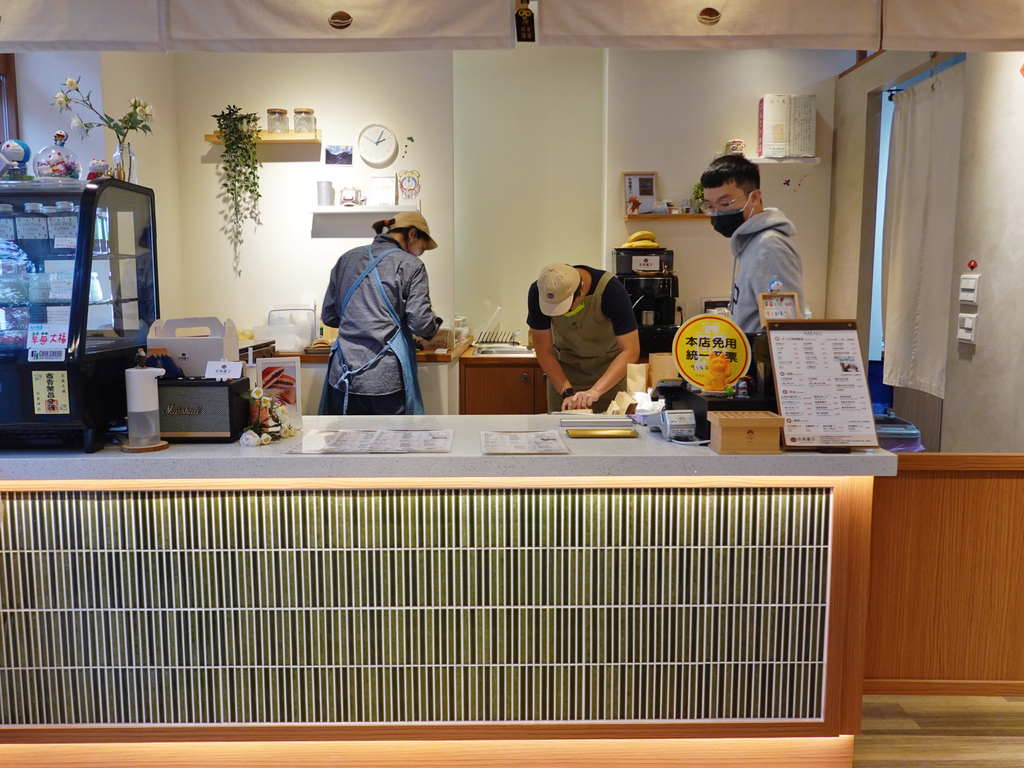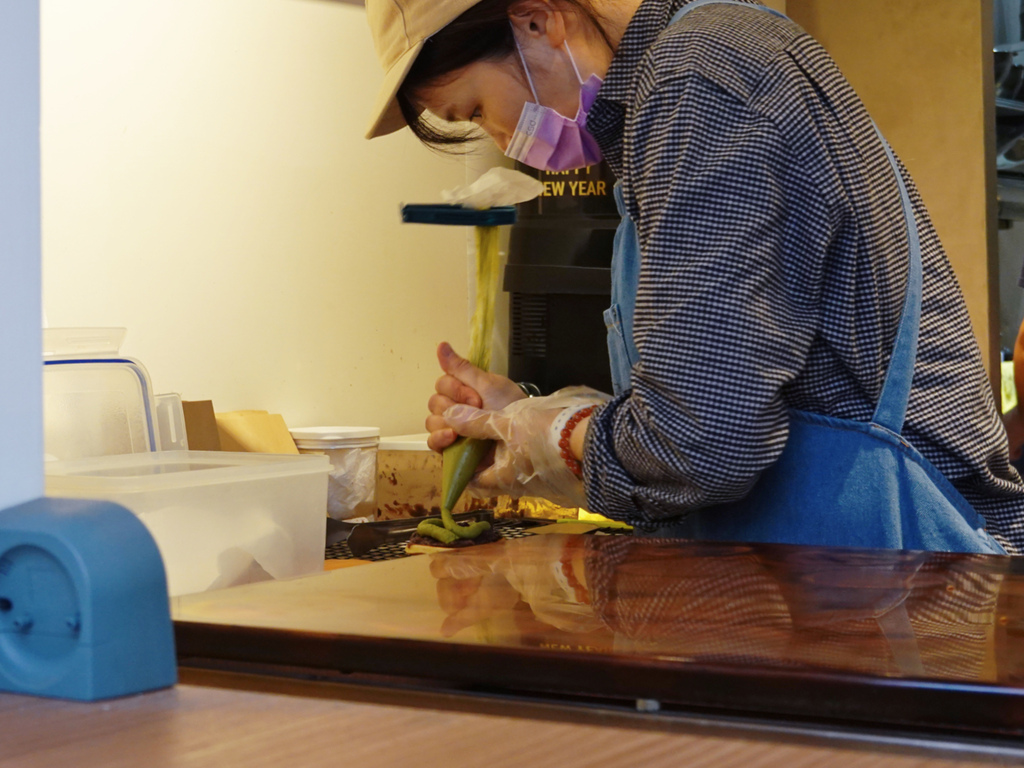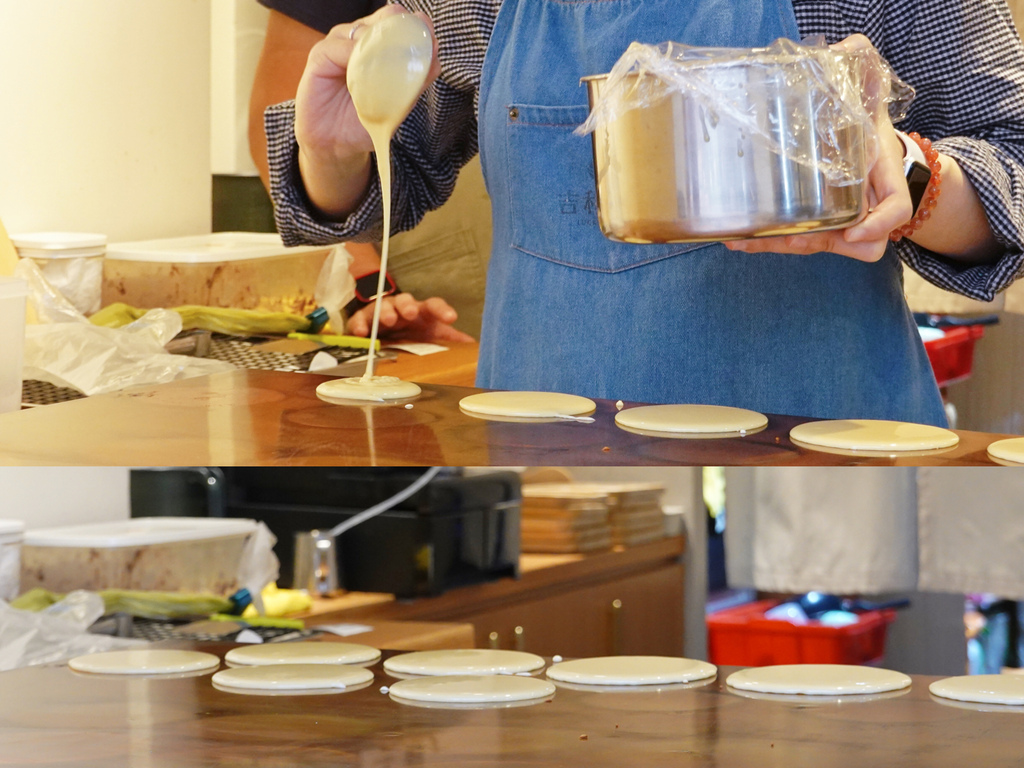 透過木窗往裡窺看,是店員正在現烤銅鑼燒的餅皮,圓圓澎澎的模樣實在討喜,空氣中瀰漫著甜甜的蜂蜜香氣,心情也隨之愉悅起來。