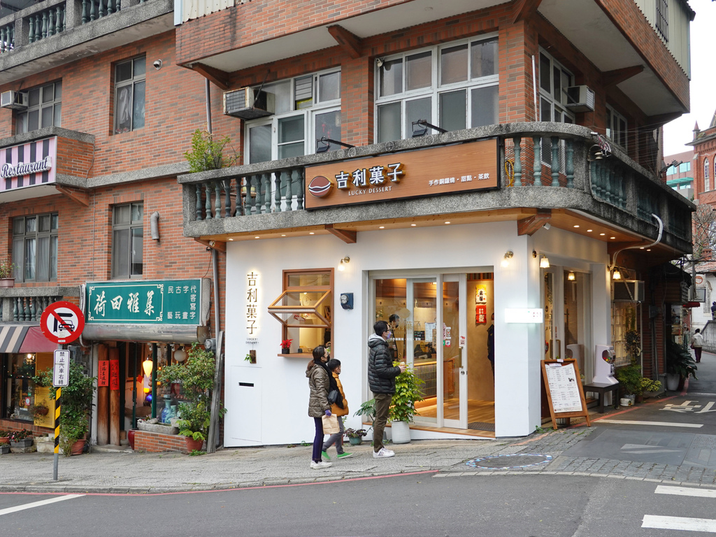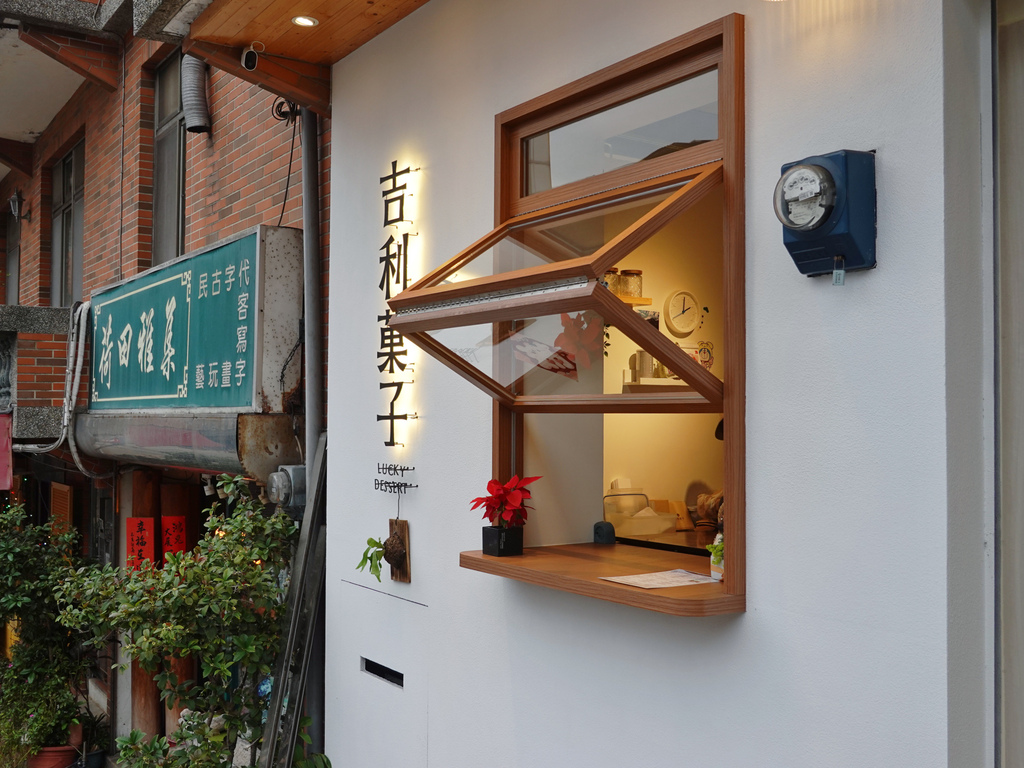 在馬偕博士銅像旁,眾多紅磚老宅建築中,這家「吉利菓子」顯得格外吸睛,以白色牆面搭配些許綠意,木窗框與招牌的點綴,更散發出淡雅風格,與復古氛圍相得益彰。