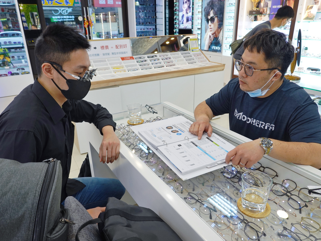 在使用專業器材驗光的同時,也會經由聊天瞭解平常的用鏡及生活習慣,以做最適當的個人化調整,這些都是靠經驗所累積出來的。