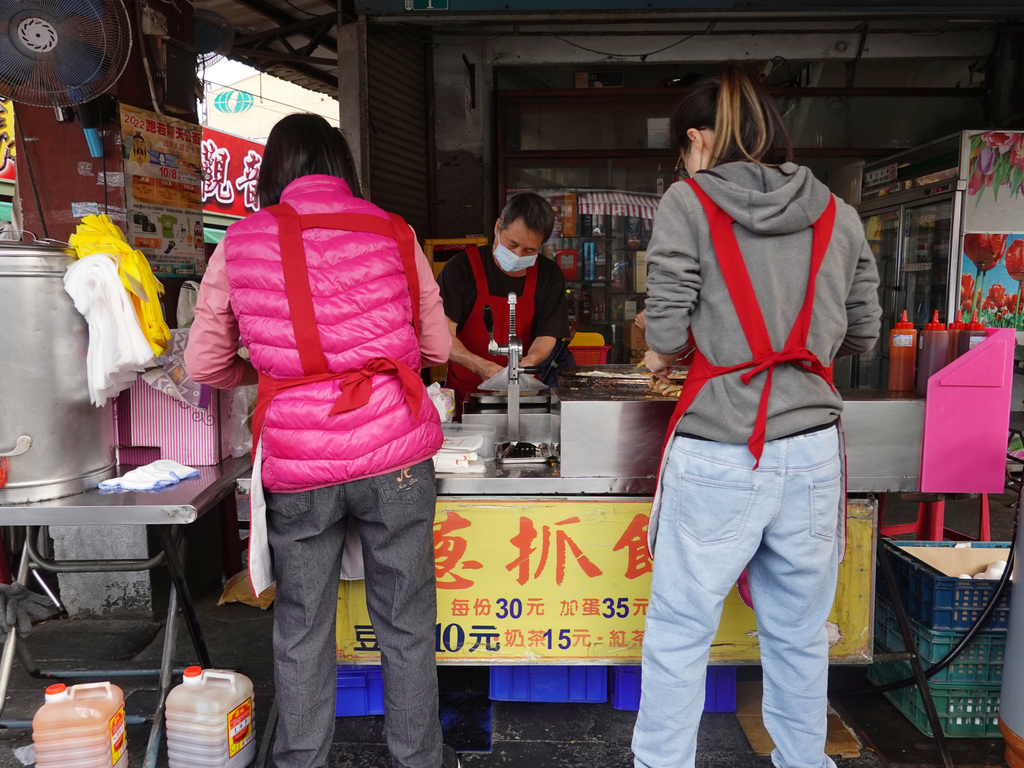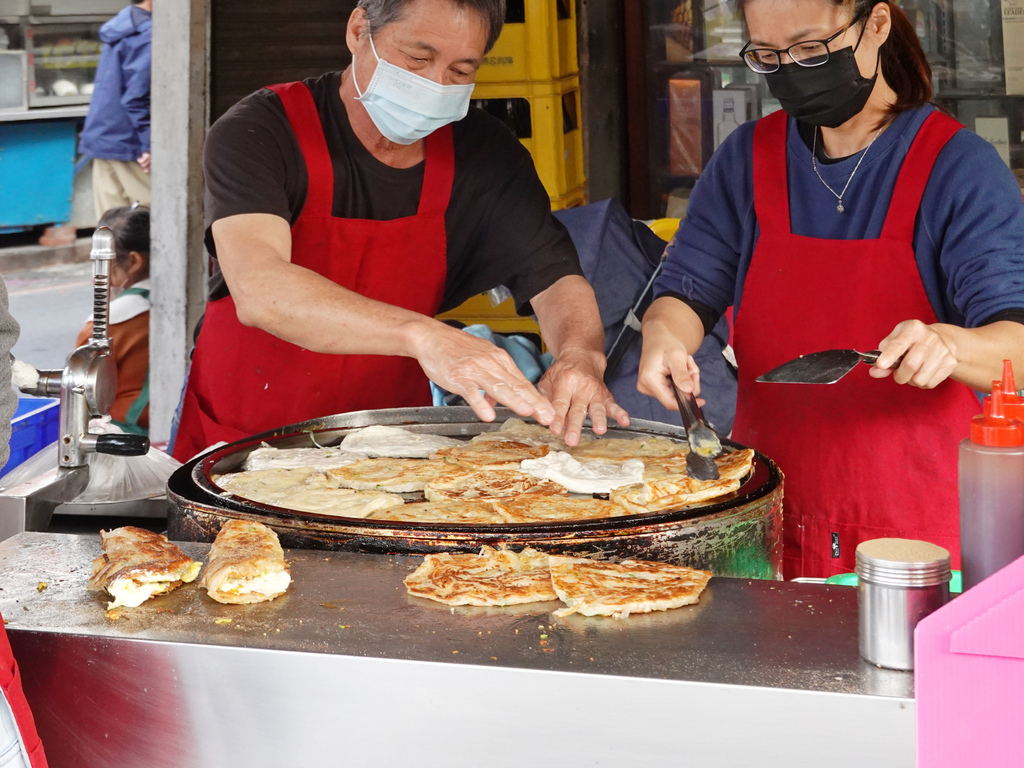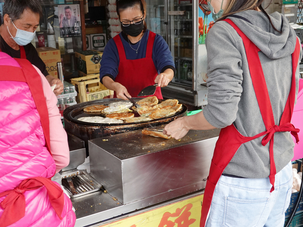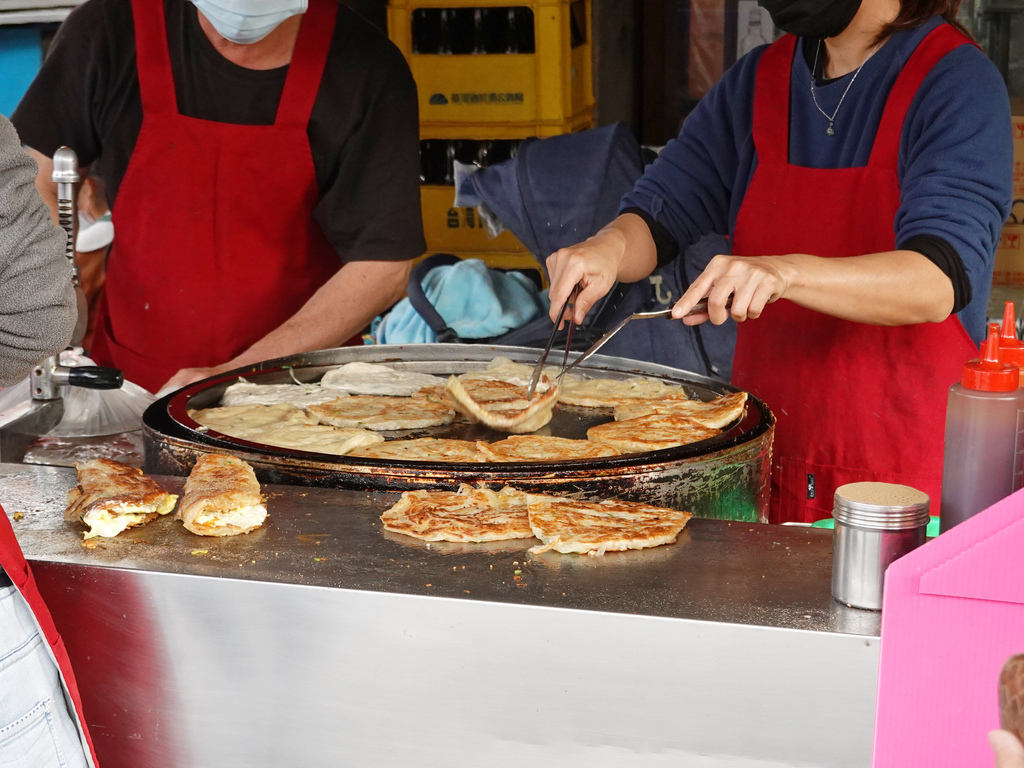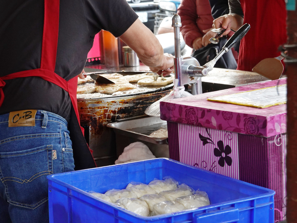 一位先將麵團壓平後鋪上煎台;另一位不停的將餅皮翻動,製造出空氣感與酥脆感;接著下一位將蔥抓餅撒上胡椒粉、淋上醬汁並裝袋;最後,則是點餐跟收錢的角色。整體一氣呵成,滿有默契,才足以負荷蜂擁而至的購買人潮。