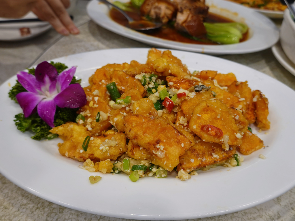 「大湖餐館」的南瓜鹹蛋既甜又帶著鹹蛋香氣,炸物裹粉毫不厚重,薄脆不膩口,很是喜歡。
