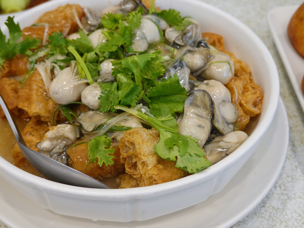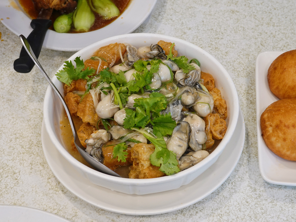 有別於「富錦樹香檳台菜」的蒜蓉醬,「大湖餐館」更單純的使用薑絲鮮蚵,以食材本身的新鮮度直球對決。鮮蚵鮮甜肥美,無多加調味即美味;油條脆口,沾到芡汁的部分則稍微軟化,口感絕妙,簡單粗暴又耐吃,必點。