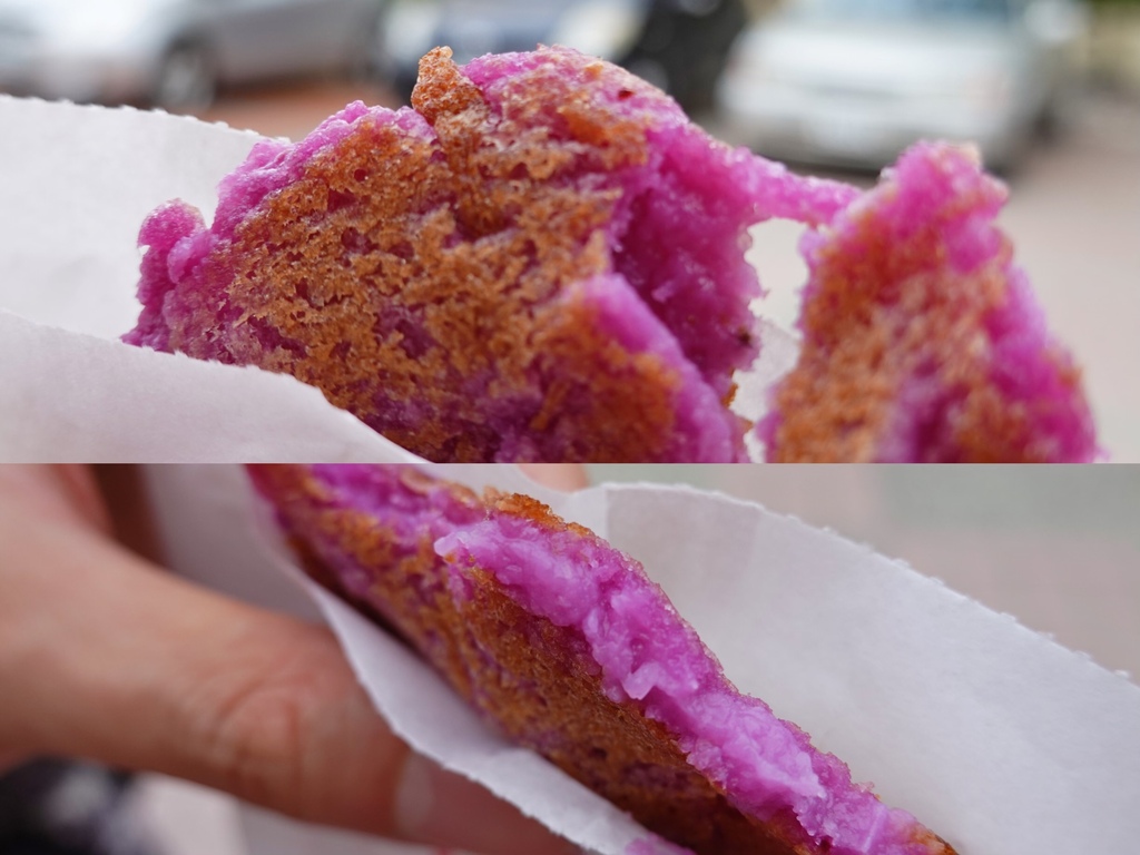 由於購買人潮絡繹不絕,所以拿到手的紅薯餅皆是剛起鍋的,極其燙手與燙口。在放涼了幾分鐘後,貓舌頭的我迫不及待吃上一口,外頭帶點酥酥的,裡頭是軟中帶Q,還有些山藥的黏稠感。
