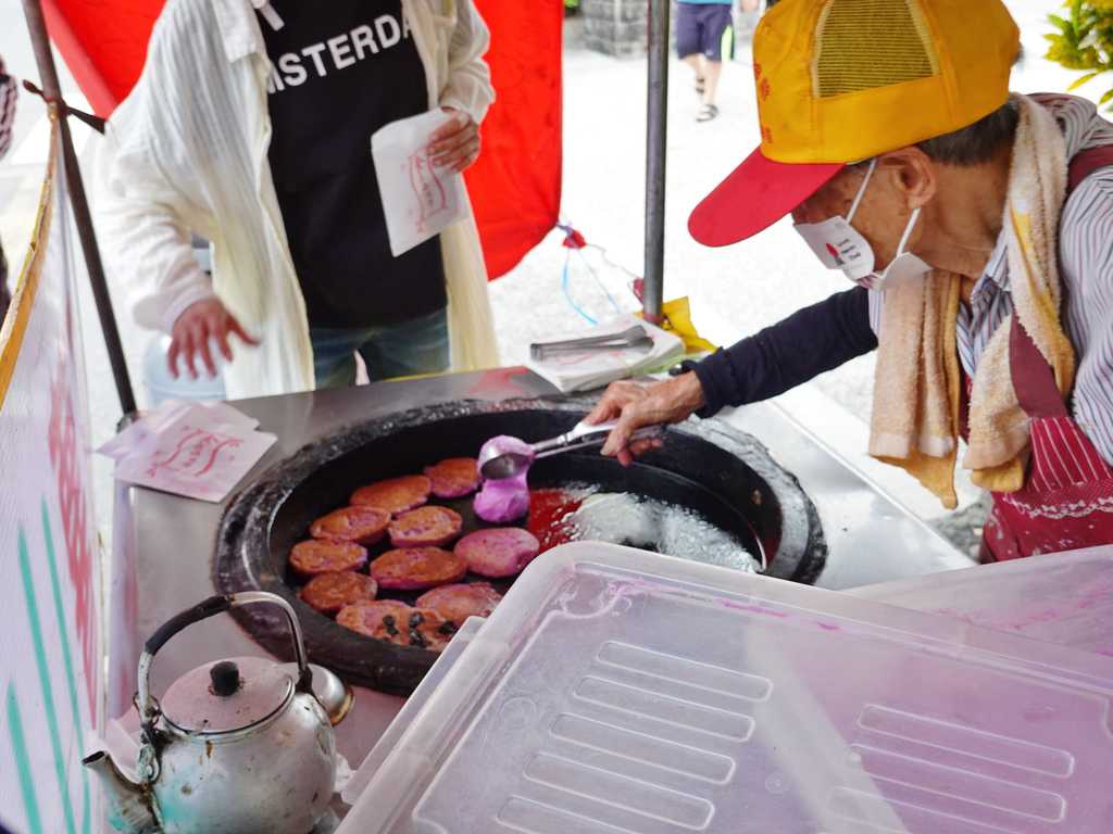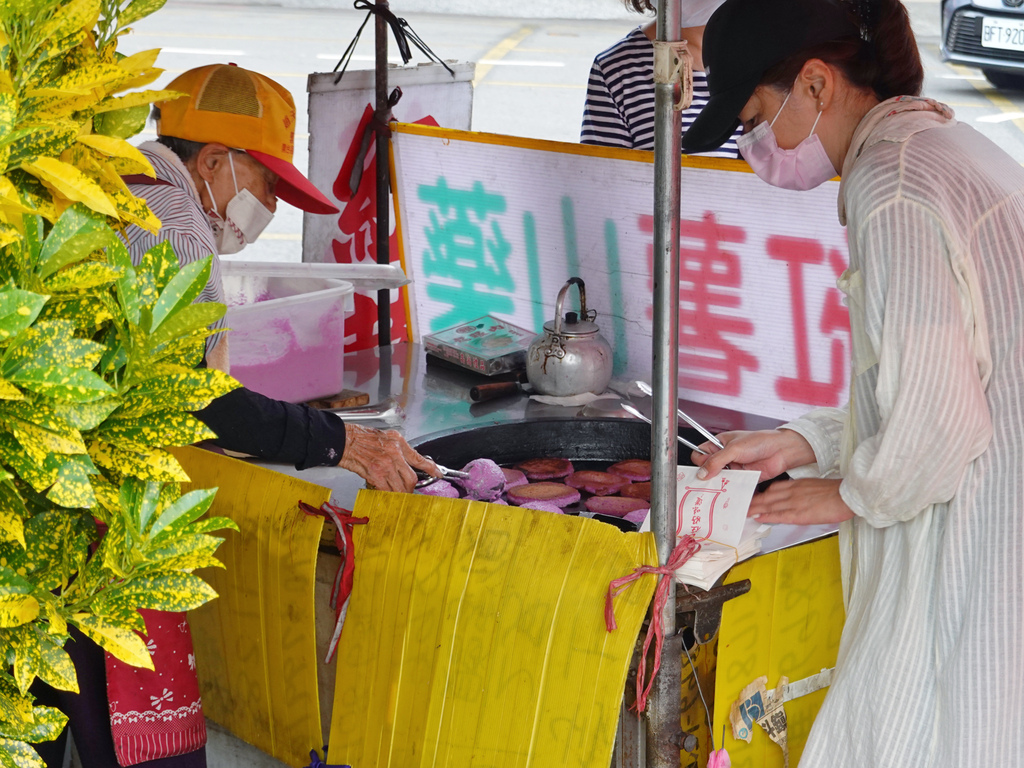 只見煎台旁的老奶奶,不斷從保鮮盒內勺出一球球的紅薯泥,並以鍋鏟壓平慢煎,很難想像這個動作已經重複了二十餘年,無論春夏秋冬、下雨或是炎熱高溫,這般的堅持實在令我欽佩與不捨。